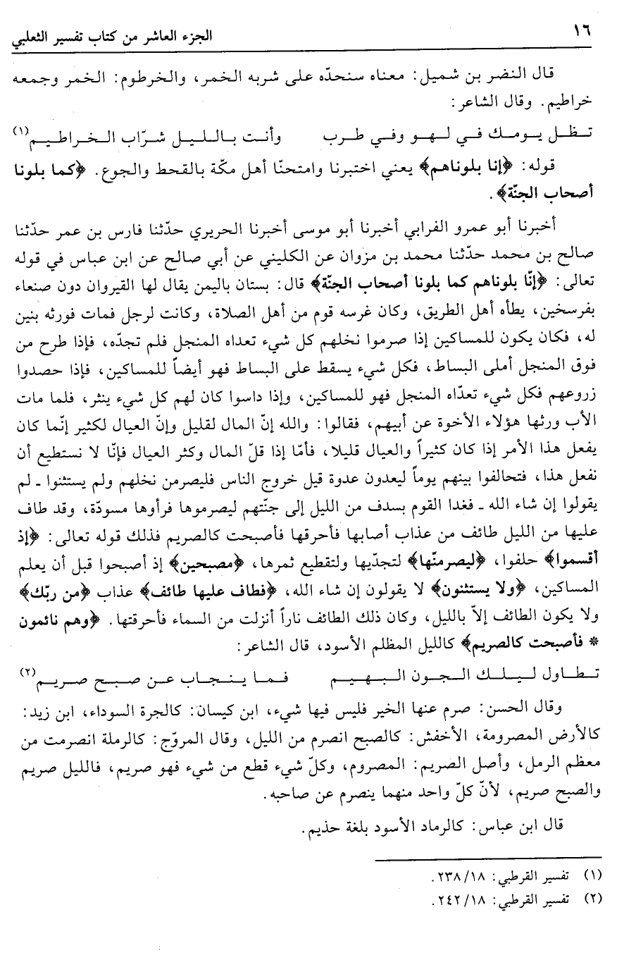 أخبرنا أبو عمرو الفرابي أخبرنا أبو موسى أخبرنا الحريري حدّثنا فارس بن عمر حدّثنا صالح بن محمد حدّثنا محمد بن مزوان عن الكليني عن أبي صالح عن ابن عباس في قوله تعالى: إِنَّا بَلَوْناهُمْ كَما بَلَوْنا أَصْحابَ الْجَنَّةِ قال: بستان باليمن يقال لها القيروان دون صنعاء بفرسخين، يطأه أهل الطريق، وكان غرسه قوم من أهل الصلاة، وكانت لرجل فمات فورثه بنين له، فكان يكون للمساكين إذا صرموا نخلهم كل شيء تعداه المنجل فلم تجدّه، فإذا طرح من فوق المنجل أملى البساط، فكل شيء يسقط على البساط فهو أيضا للمساكين، فإذا حصدوا زروعهم فكل شيء تعدّاه المنجل فهو للمساكين، وإذا داسوا كان لهم كل شيء ينثر، فلما مات الأب ورثها هؤلاء الأخوة عن أبيهم، فقالوا: والله إنّ المال لقليل وإنّ العيال لكثير إنّما كان يفعل هذا الأمر إذا كان كثيرا والعيال قليلا، فأمّا إذا قلّ المال وكثر العيال فإنّا لا نستطيع أن نفعل هذا، فتحالفوا بينهم يوما ليعدون عدوة قيل خروج الناس فليصر من نخلهم ولم يستثنوا- لم يقولوا إن شاء الله- فغدا القوم بسدف من الليل إلى جنّتهم ليصرموها فرأوها مسودّة، وقد طاف عليها من الليل طائف من عذاب أصابها فأحرقها فَأَصْبَحَتْ كَالصَّرِيمِ فذلك قوله تعالى: إِذْ أَقْسَمُوا حلفوا، لَيَصْرِمُنَّها لتجدّيها ولتقطيع ثمرها، مُصْبِحِينَ إذ أصبحوا قبل أن يعلم المساكين، وَلا يَسْتَثْنُونَ لا يقولون إن شاء الله، فَطافَ عَلَيْها طائِفٌ عذاب مِنْ رَبِّكَ ولا يكون الطائف إلّا بالليل، وكان ذلك الطائف نارا أنزلت من السماء فأحرقتها. وَهُمْ نائِمُونَ فَأَصْبَحَتْ كَالصَّرِيمِ كالليل المظلم الأسود، قال الشاعر: