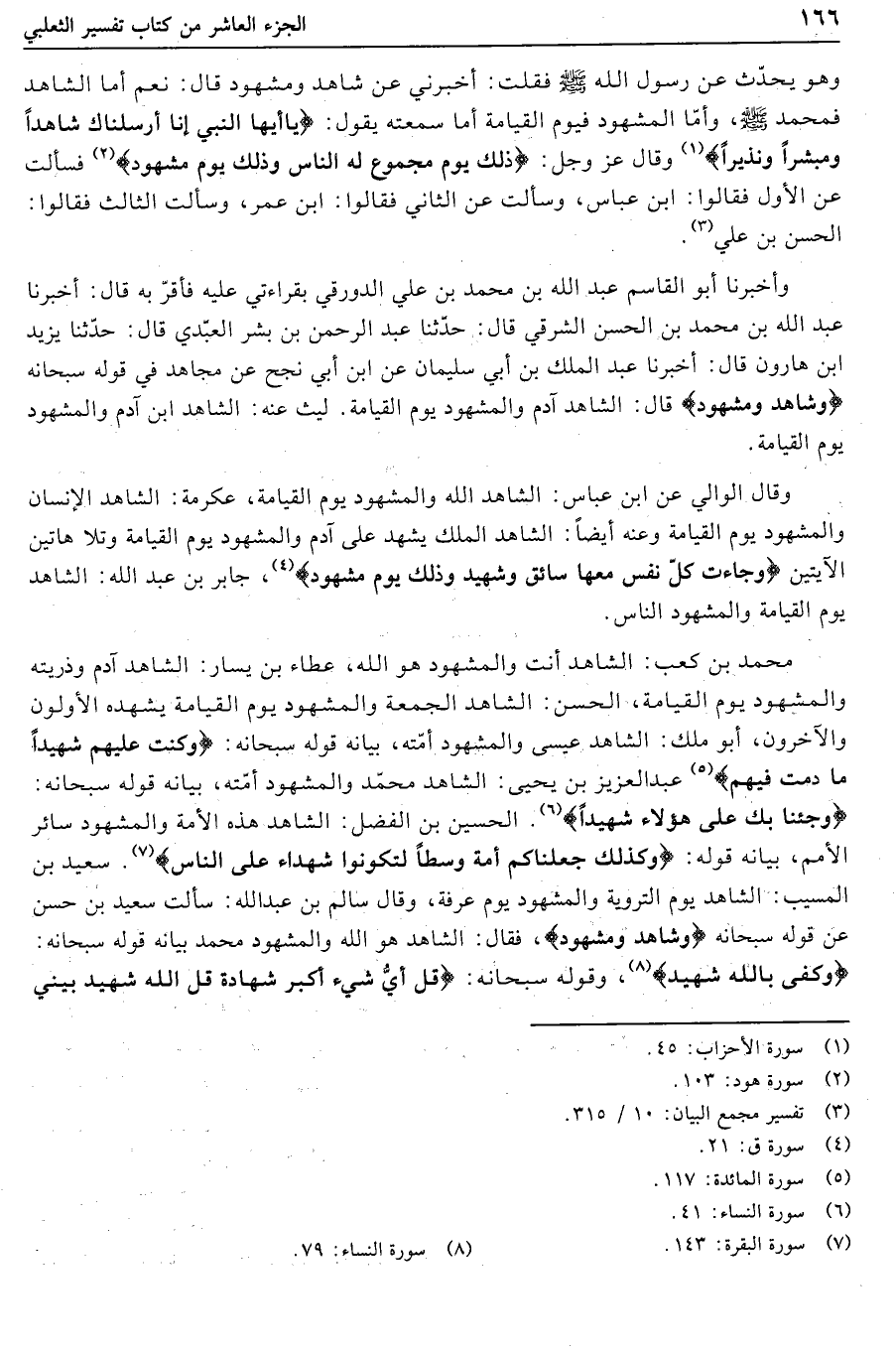 وَجِئْنا بِكَ عَلى هؤُلاءِ شَهِيداً «6» . الحسين بن الفضل: الشاهد هذه الأمة والمشهود سائر الأمم، بيانه قوله: وَكَذلِكَ جَعَلْناكُمْ أُمَّةً وَسَطاً لِتَكُونُوا شُهَداءَ عَلَى النَّاسِ «7» . سعيد بن المسيب: الشاهد يوم التروية والمشهود يوم عرفة، وقال سالم بن عبد الله: سألت سعيد بن حسن عن قوله سبحانه وَشاهِدٍ وَمَشْهُودٍ، فقال: الشاهد هو الله والمشهود محمد بيانه قوله سبحانه: