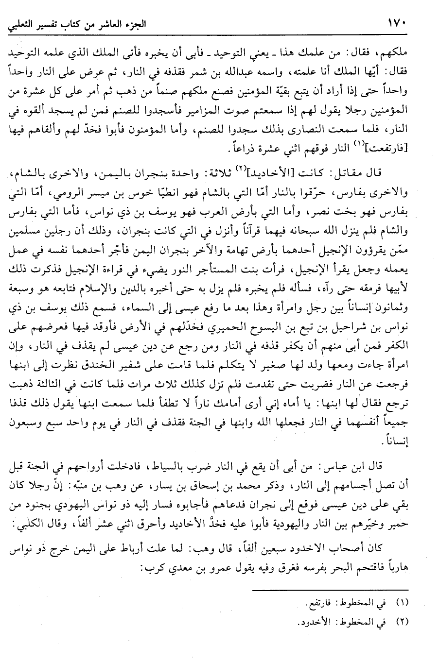 قال مقاتل: كانت [الأخاديد] «2» ثلاثة: واحدة بنجران باليمن، والاخرى بالشام، والاخرى بفارس، حرّقوا بالنار أمّا التي بالشام فهو أنطياخوس بن ميسر الرومي، أمّا التي بفارس فهو بخت نصر، وأما التي بأرض العرب فهو يوسف بن ذي نواس، فأما التي بفارس والشام فلم ينزل الله سبحانه فيهما قرآنا وأنزل في التي كانت بنجران، وذلك أن رجلين مسلمين ممّن يقرءون الإنجيل أحدهما بأرض تهامة والآخر بنجران اليمن فأجّر أحدهما نفسه في عمل يعمله وجعل يقرأ الإنجيل، فرأت بنت المستأجر النور يضيء في قراءة الإنجيل فذكرت ذلك لأبيها فرمقه حتى رآه، فسأله فلم يخبره فلم يزل به حتى أخبره بالدين والإسلام فتابعه هو وسبعة وثمانون إنسانا بين رجل وامرأة وهذا بعد ما رفع عيسى إلى السماء، فسمع ذلك يوسف بن ذي نواس بن شراحيل بن تبع بن اليسوح الحميري فخدّ لهم في الأرض فأوقد فيها فعرضهم على الكفر فمن أبى منهم أن يكفر قذفه في النار ومن رجع عن دين عيسى لم يقذف في النار، وإن امرأة جاءت ومعها ولد لها صغير لا يتكلم فلما قامت على شفير الخندق نظرت إلى ابنها فرجعت عن النار فضربت حتى تقدمت فلم تزل كذلك ثلاث مرات فلما كانت في الثالثة ذهبت ترجع فقال لها ابنها: يا أماه إني أرى أمامك نارا لا تطفأ فلما سمعت ابنها يقول ذلك قذفا جميعا أنفسهما في النار فجعلها الله وابنها في الجنة فقذف في النار في يوم واحد سبع وسبعون إنسانا.