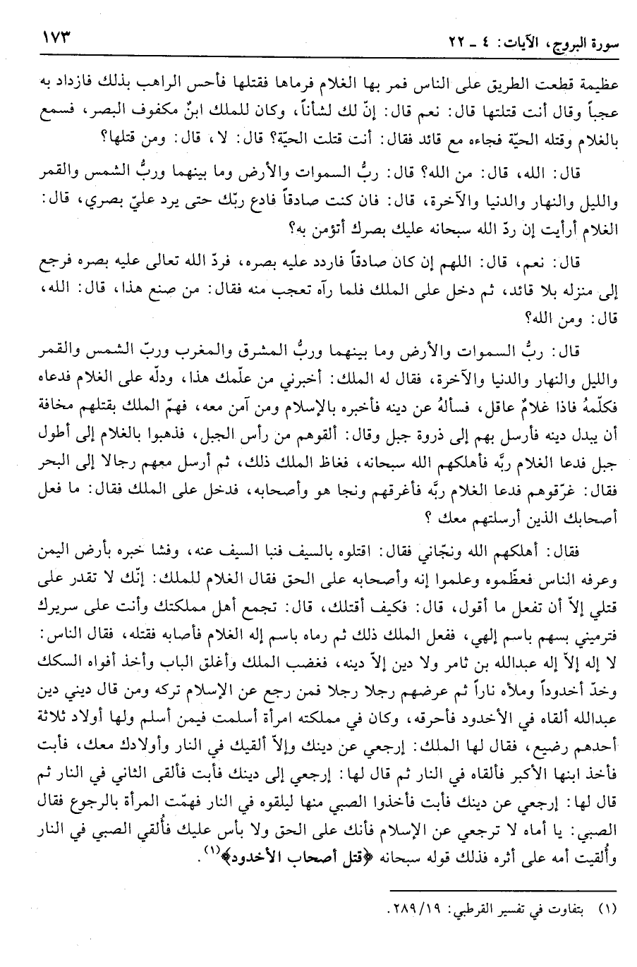 لا إله إلّا إله عبد الله بن ثامر ولا دين إلّا دينه، فغضب الملك وأغلق الباب وأخذ أفواه السكك وخدّ أخدودا وملأه نارا ثم عرضهم رجلا رجلا فمن رجع عن الإسلام تركه ومن قال ديني دين عبد الله ألقاه في الأخدود فأحرقه، وكان في مملكته امرأة أسلمت فيمن أسلم ولها أولاد ثلاثة أحدهم رضيع، فقال لها الملك: ارجعي عن دينك وإلّا ألقيك في النار وأولادك معك، فأبت فأخذ ابنها الأكبر فألقاه في النار ثم قال لها: ارجعي إلى دينك فأبت فألقى الثاني في النار ثم قال لها: ارجعي عن دينك فأبت فأخذوا الصبي منها ليلقوه في النار فهمّت المرأة بالرجوع فقال الصبي: يا أماه لا ترجعي عن الإسلام فأنك على الحق ولا بأس عليك فألقي الصبي في النار وألقيت أمه على أثره فذلك قوله سبحانه قُتِلَ أَصْحابُ الْأُخْدُودِ «1» .