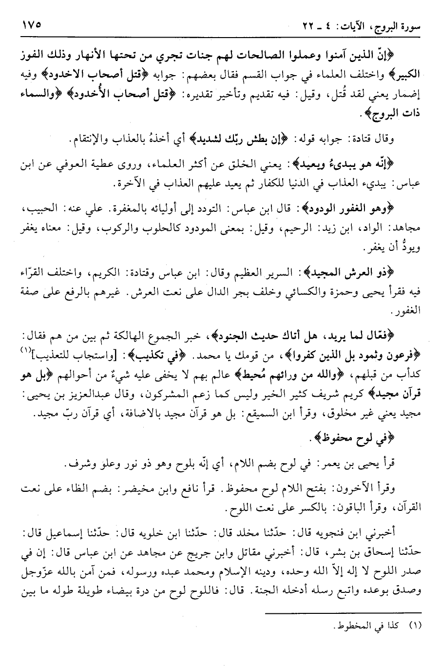 إِنَّ الَّذِينَ آمَنُوا وَعَمِلُوا الصَّالِحاتِ لَهُمْ جَنَّاتٌ تَجْرِي مِنْ تَحْتِهَا الْأَنْهارُ ذلِكَ الْفَوْزُ الْكَبِيرُ واختلف العلماء في جواب القسم فقال بعضهم: جوابه قُتِلَ أَصْحابُ الْأُخْدُودِ وفيه إضمار يعني لقد قتل، وقيل: فيه تقديم وتأخير تقديره: قُتِلَ أَصْحابُ الْأُخْدُودِ وَالسَّماءِ ذاتِ الْبُرُوجِ.