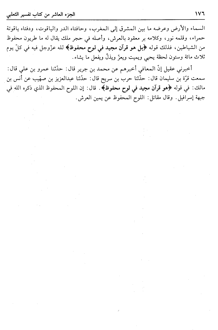 سمعت قرّة بن سليمان قال: حدّثنا حرب بن سريح قال: حدّثنا عبد العزيز بن صهّيب عن أنس بن مالك: في قوله هُوَ قُرْآنٌ مَجِيدٌ فِي لَوْحٍ مَحْفُوظٍ. قال: إن اللوح المحفوظ الذي ذكره الله في جبهة إسرافيل. وقال مقاتل: اللوح المحفوظ عن يمين العرش.