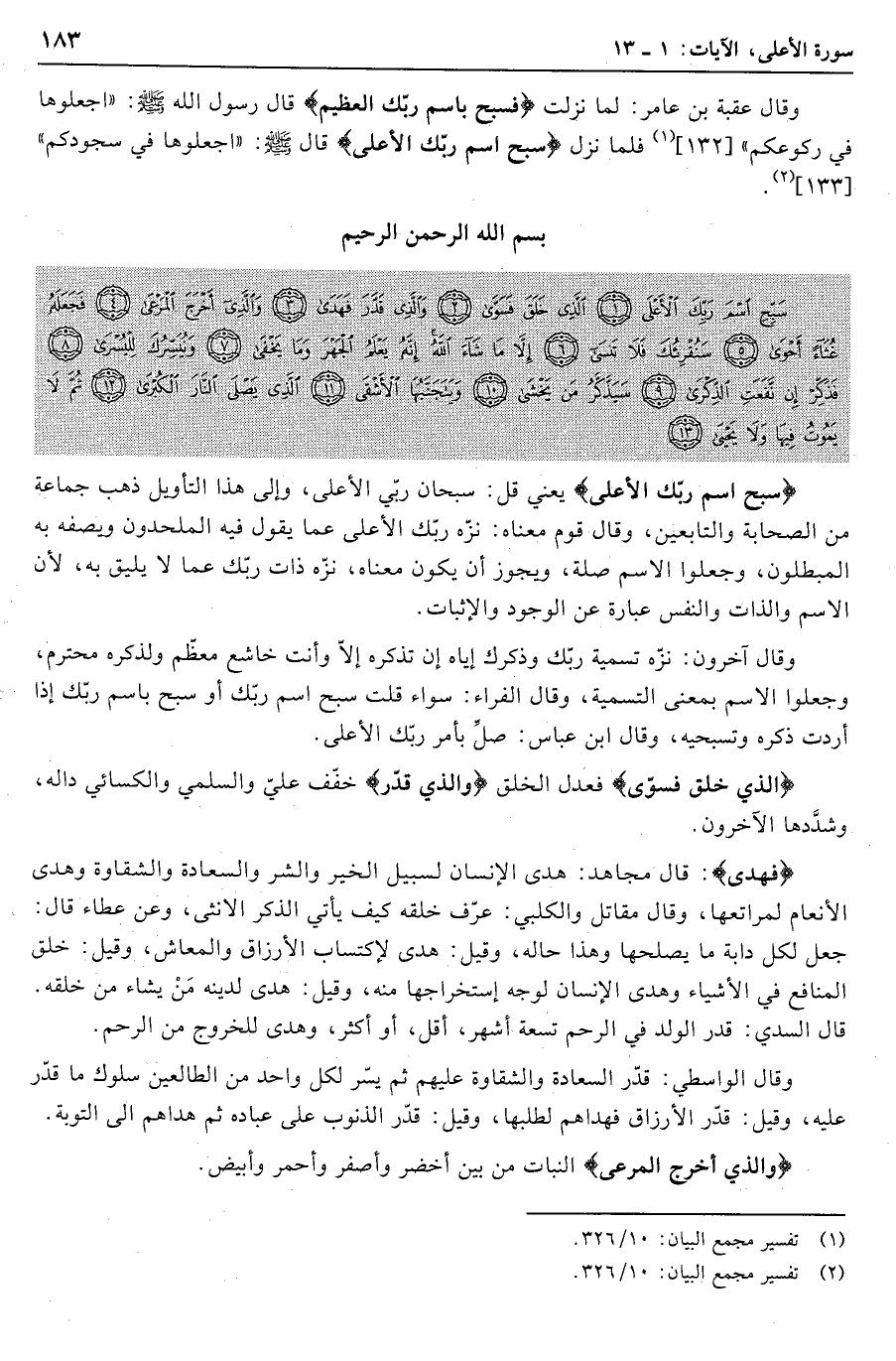 سَبِّحِ اسْمَ رَبِّكَ الْأَعْلَى (1) الَّذِي خَلَقَ فَسَوَّى (2) وَالَّذِي قَدَّرَ فَهَدى (3) وَالَّذِي أَخْرَجَ الْمَرْعى (4)