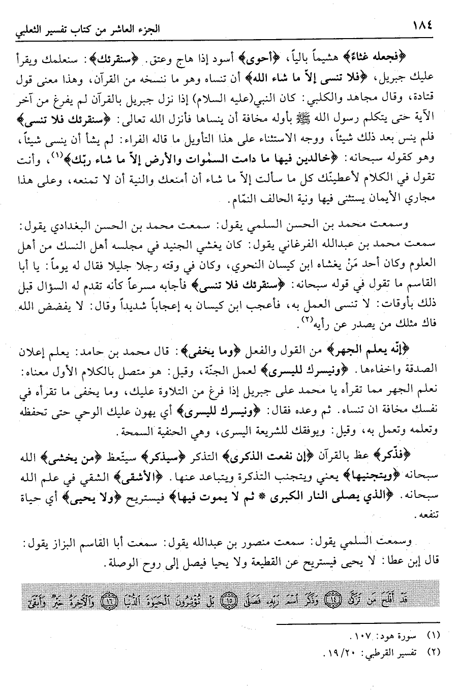 فَجَعَلَهُ غُثاءً هشيما باليا، أَحْوى أسود إذا هاج وعتق. سَنُقْرِئُكَ: سنعلمك ويقرأ عليك جبريل، فَلا تَنْسى إِلَّا ما شاءَ اللَّهُ أن تنساه وهو ما ننسخه من القرآن، وهذا معنى قول قتادة،