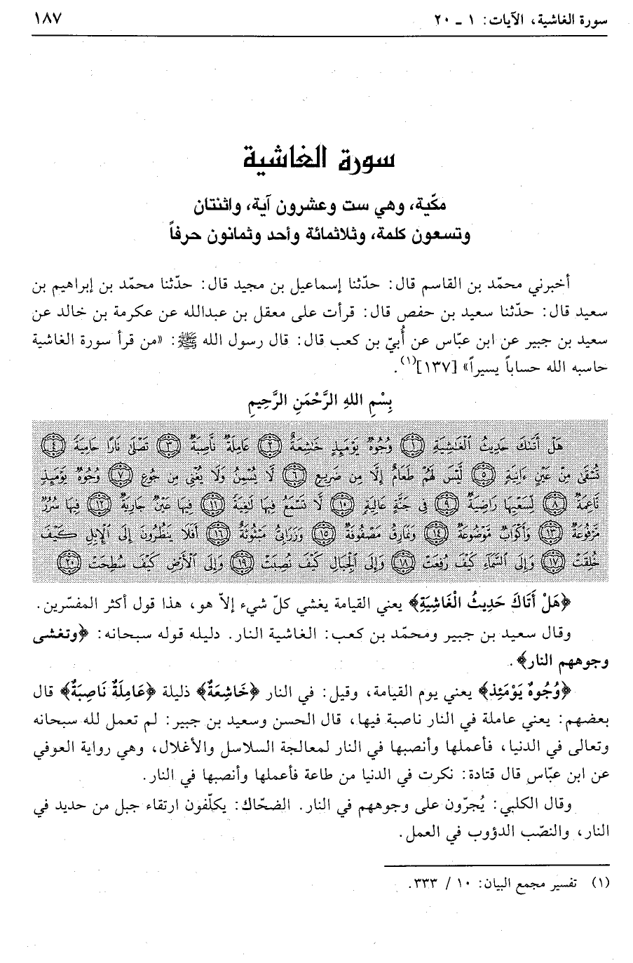 وقال سعيد بن جبير ومحمّد بن كعب: الغاشية النار. دليله قوله سبحانه: وَتَغْشى وُجُوهَهُمُ النَّارُ ...