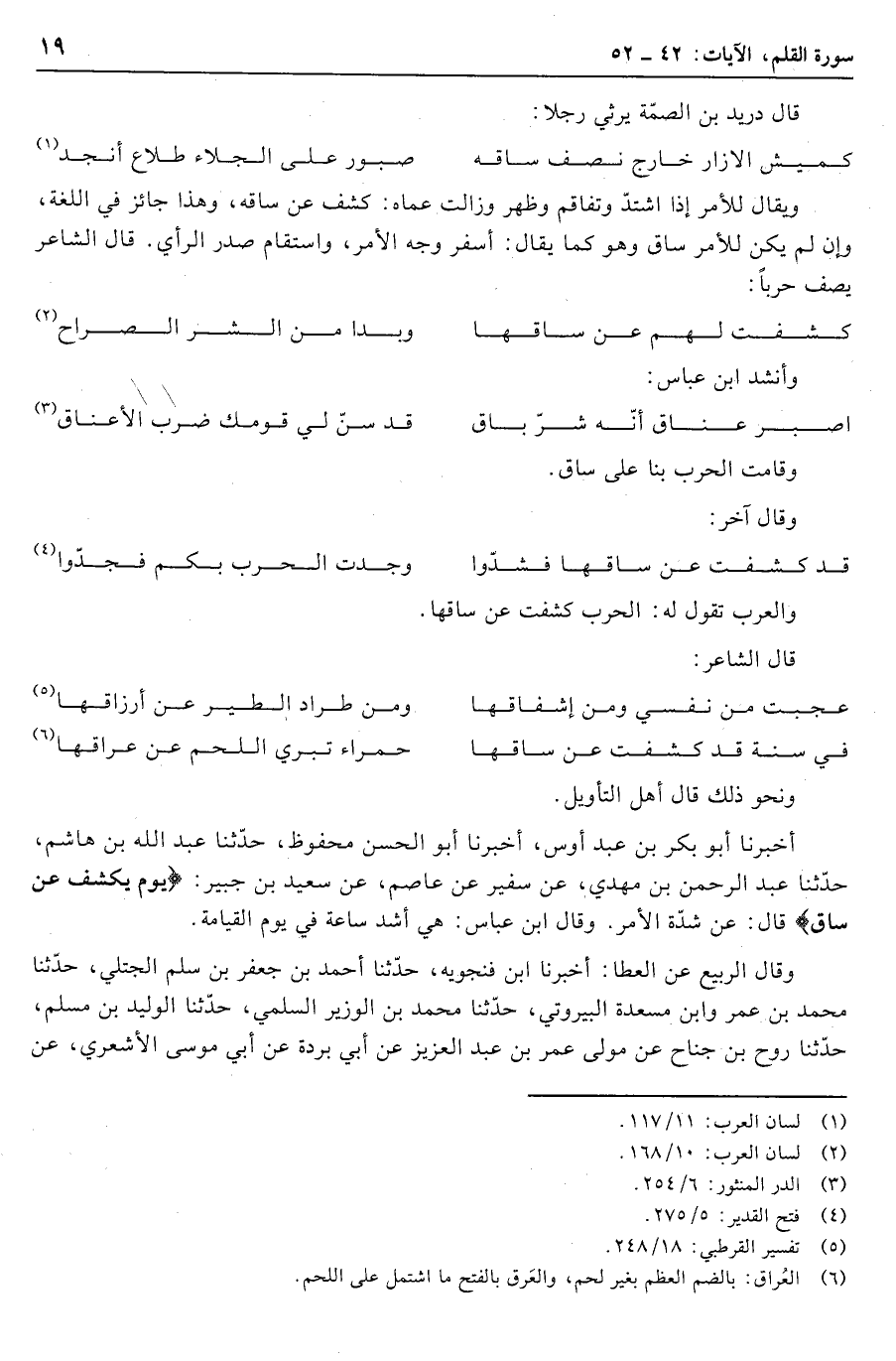 أخبرنا أبو بكر بن عبد أوس، أخبرنا أبو الحسن محفوظ، حدّثنا عبد الله بن هاشم، حدّثنا عبد الرحمن بن مهدي، عن سفير عن عاصم، عن سعيد بن جبير: يَوْمَ يُكْشَفُ عَنْ ساقٍ قال: عن شدّة الأمر. وقال ابن عباس: هي أشد ساعة في يوم القيامة.