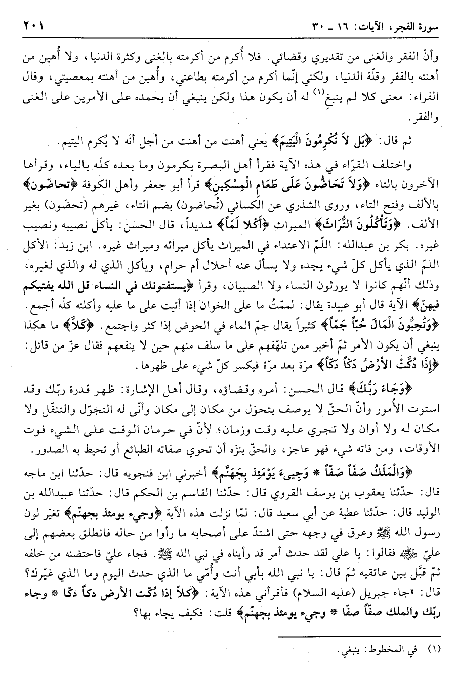 واختلف القرّاء في هذه الآية فقرأ أهل البصرة يكرمون وما بعده كلّه بالياء، وقرأها الآخرون بالتاء وَلا تَحَاضُّونَ عَلى طَعامِ الْمِسْكِينِ قرأ أبو جعفر وأهل الكوفة تَحَاضُّونَ بالألف وفتح التاء، وروى الشذري عن الكسائي (تُحَاضُّونَ) بضم التاء، غيرهم (تحضّون) بغير الألف. وَتَأْكُلُونَ التُّراثَ الميراث أَكْلًا لَمًّا شديدا، قال الحسن: يأكل نصيبه ونصيب غيره. بكر بن عبد الله: اللّمّ الاعتداء في الميراث يأكل ميراثه وميراث غيره. ابن زيد: الأكل اللمّ الذي يأكل كلّ شيء يجده ولا يسأل عنه أحلال أم حرام، ويأكل الذي له والذي لغيره، وذلك أنّهم كانوا لا يورثون النساء ولا الصبيان، وقرأ يَسْتَفْتُونَكَ فِي النِّساءِ قُلِ اللَّهُ يُفْتِيكُمْ فِيهِنَّ الآية قال أبو عبيدة يقال: لممت ما على الخوان إذا أتيت على ما عليه وأكلته كلّه أجمع.