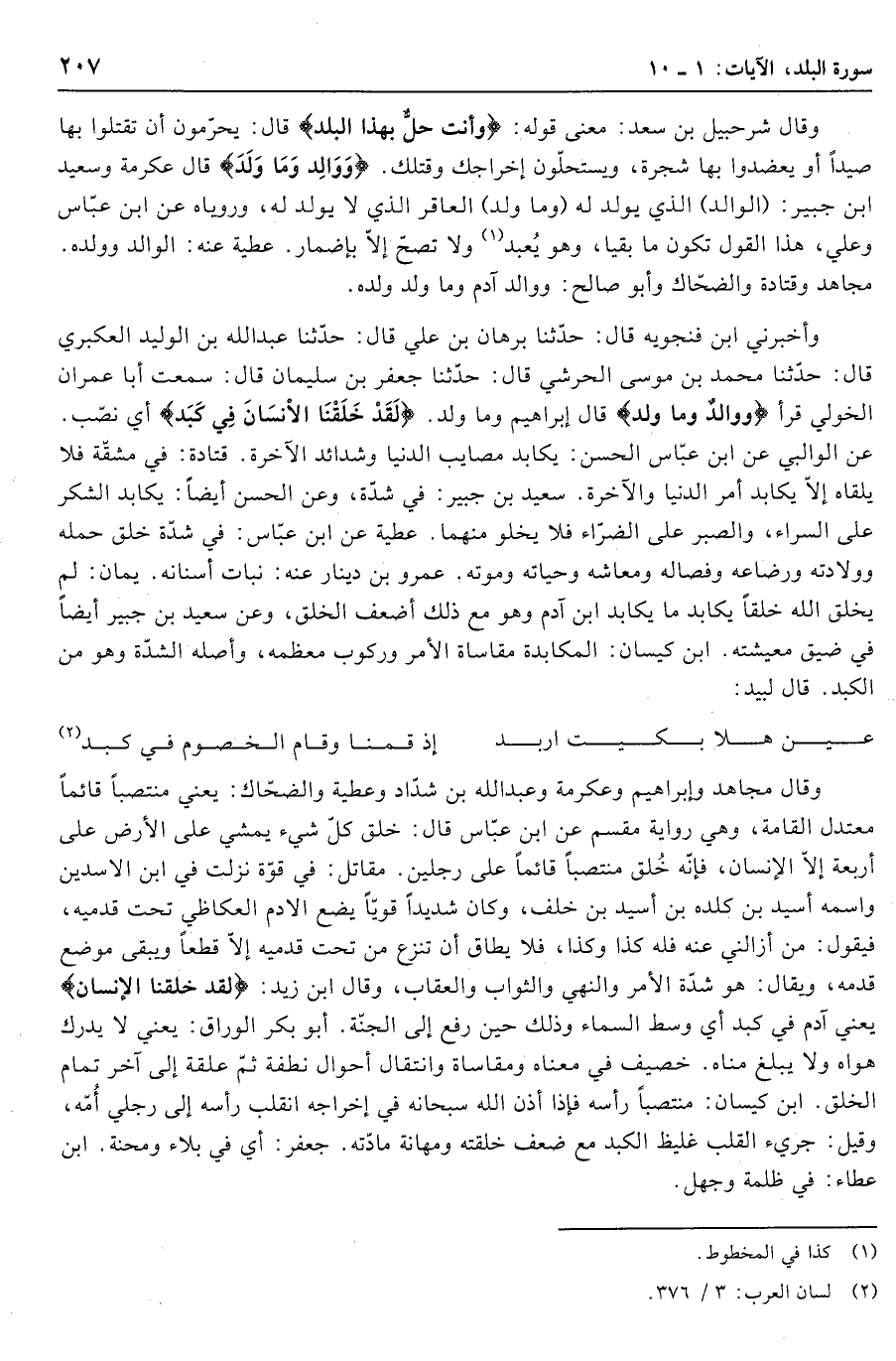 وأخبرني ابن فنجويه قال: حدّثنا برهان بن علي قال: حدّثنا عبد الله بن الوليد العكبري قال: حدّثنا محمد بن موسى الحرشي قال: حدّثنا جعفر بن سلميان قال: سمعت أبا عمران الخولي قرأ وَوالِدٍ وَما وَلَدَ قال إبراهيم وما ولد. لَقَدْ خَلَقْنَا الْإِنْسانَ فِي كَبَدٍ أي نصّب.