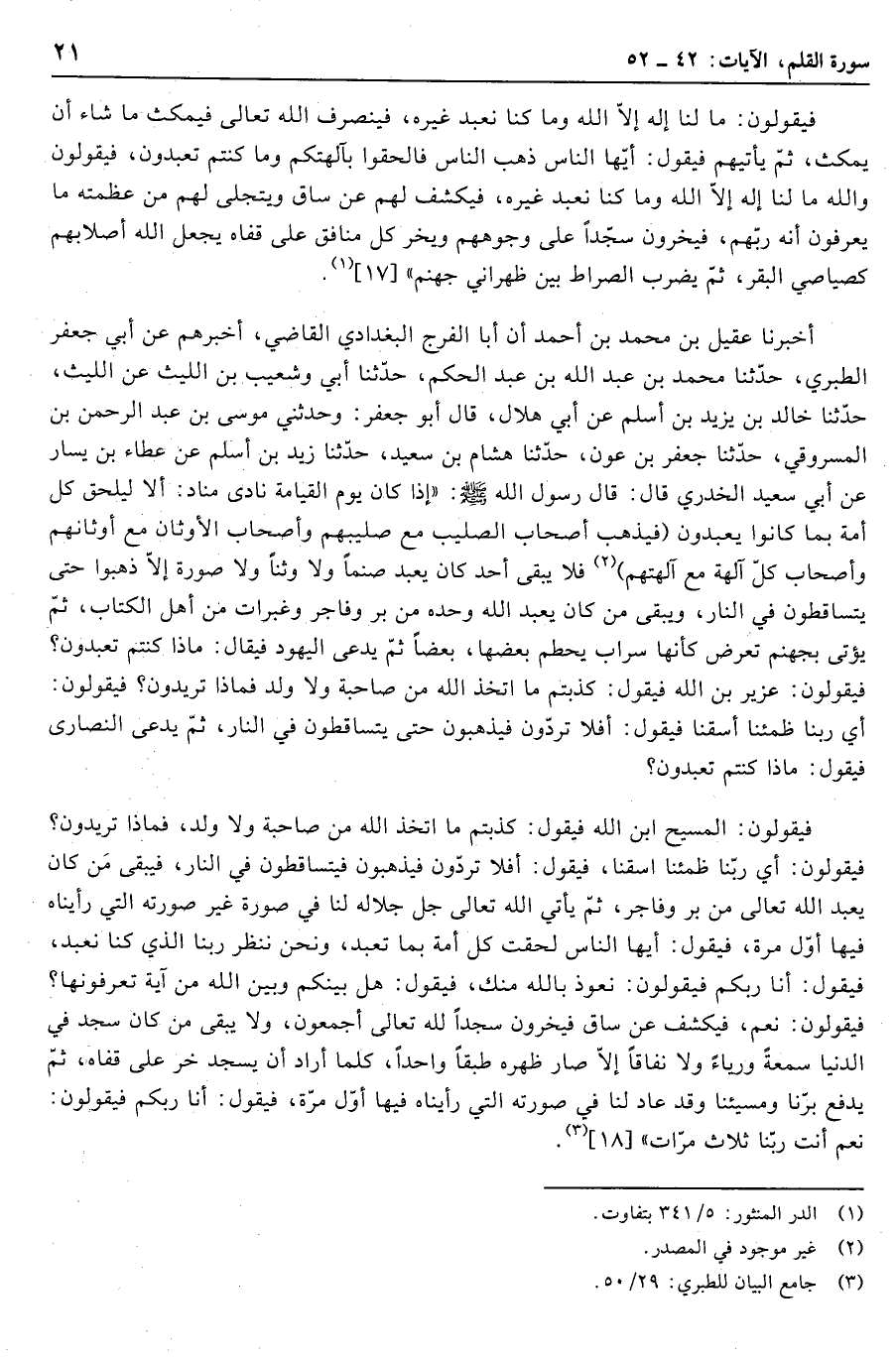 أخبرنا عقيل بن محمد بن أحمد أن أبا الفرج البغدادي القاضي، أخبرهم عن أبي جعفر الطبري، حدّثنا محمد بن عبد الله بن عبد الحكم، حدّثنا أبي وشعيب بن الليث عن الليث، حدّثنا خالد بن يزيد بن أسلم عن أبي هلال، قال أبو جعفر: وحدّثني موسى بن عبد الرحمن بن المسروقي، حدّثنا جعفر بن عون، حدّثنا هشام بن سعيد، حدّثنا زيد بن أسلم عن عطاء بن يسار عن أبي سعيد الخدري قال: قال رسول الله صلّى الله عليه وسلّم: «إذا كان يوم القيامة نادى مناد: ألا ليلحق كل أمة بما كانوا يعبدون (فيذهب أصحاب الصليب مع صليبهم وأصحاب الأوثان مع أوثانهم وأصحاب كلّ آلهة مع آلهتهم) «2» فلا يبقى أحد كان يعبد صنما ولا وثنا ولا صورة إلّا ذهبوا حتى يتساقطون في النار، ويبقى من كان يعبد الله وحده من بر وفاجر وغبرات من أهل الكتاب، ثمّ يؤتى بجهنم تعرض كأنها سراب يحطم بعضها، بعضا ثمّ يدعى اليهود فيقال: ماذا كنتم تعبدون؟