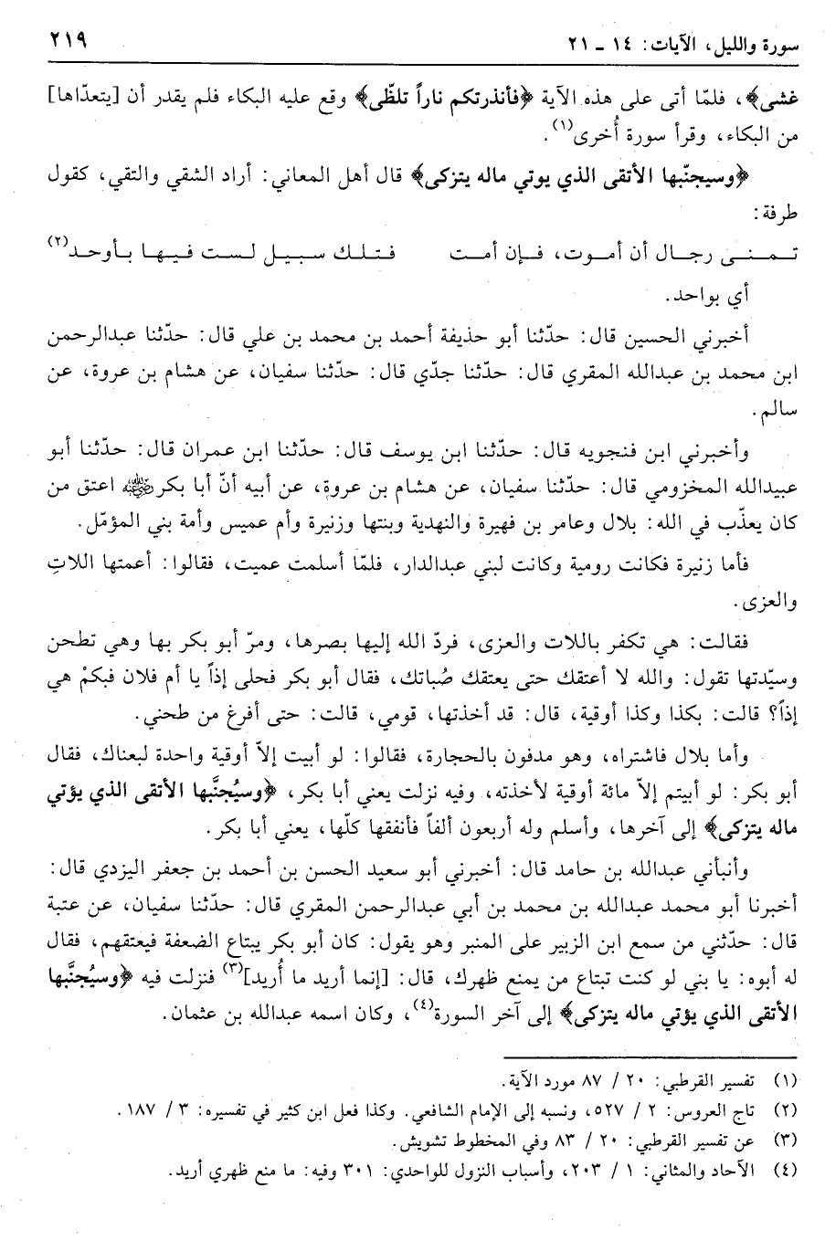 أخبرنا أبو محمد عبد الله بن محمد بن أبي عبد الرحمن المقري قال: حدّثنا سفيان، عن عتبة قال: حدّثني من سمع ابن الزبير على المنبر وهو يقول: كان أبو بكر يبتاع الضعفة فيعتقهم، فقال له أبوه: يا بني لو كنت تبتاع من يمنع ظهرك، قال: [إنما أريد ما أريد] «3» فنزلت فيه وَسَيُجَنَّبُهَا الْأَتْقَى الَّذِي يُؤْتِي مالَهُ يَتَزَكَّى إلى آخر السورة «4» ، وكان اسمه عبد الله بن عثمان.