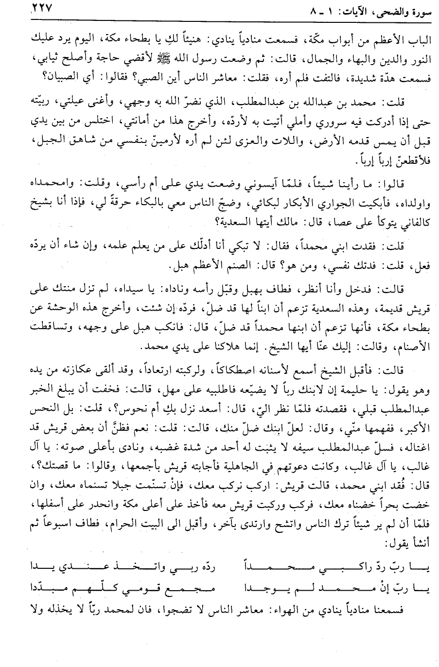 قلت: محمد بن عبد الله بن عبد المطلب، الذي نضّر الله به وجهي، وأغنى عيلتي، ربّيته حتى إذا أدركت فيه سروري وأملي أتيت به لأردّه، وأخرج هذا من أمانتي، اختلس من بين يدي قبل أن يمس قدمه الأرض، واللات والعزى لئن لم أره لأرمينّ بنفسي من شاهق الجبل، فلأقطعنّ إربا إربا.