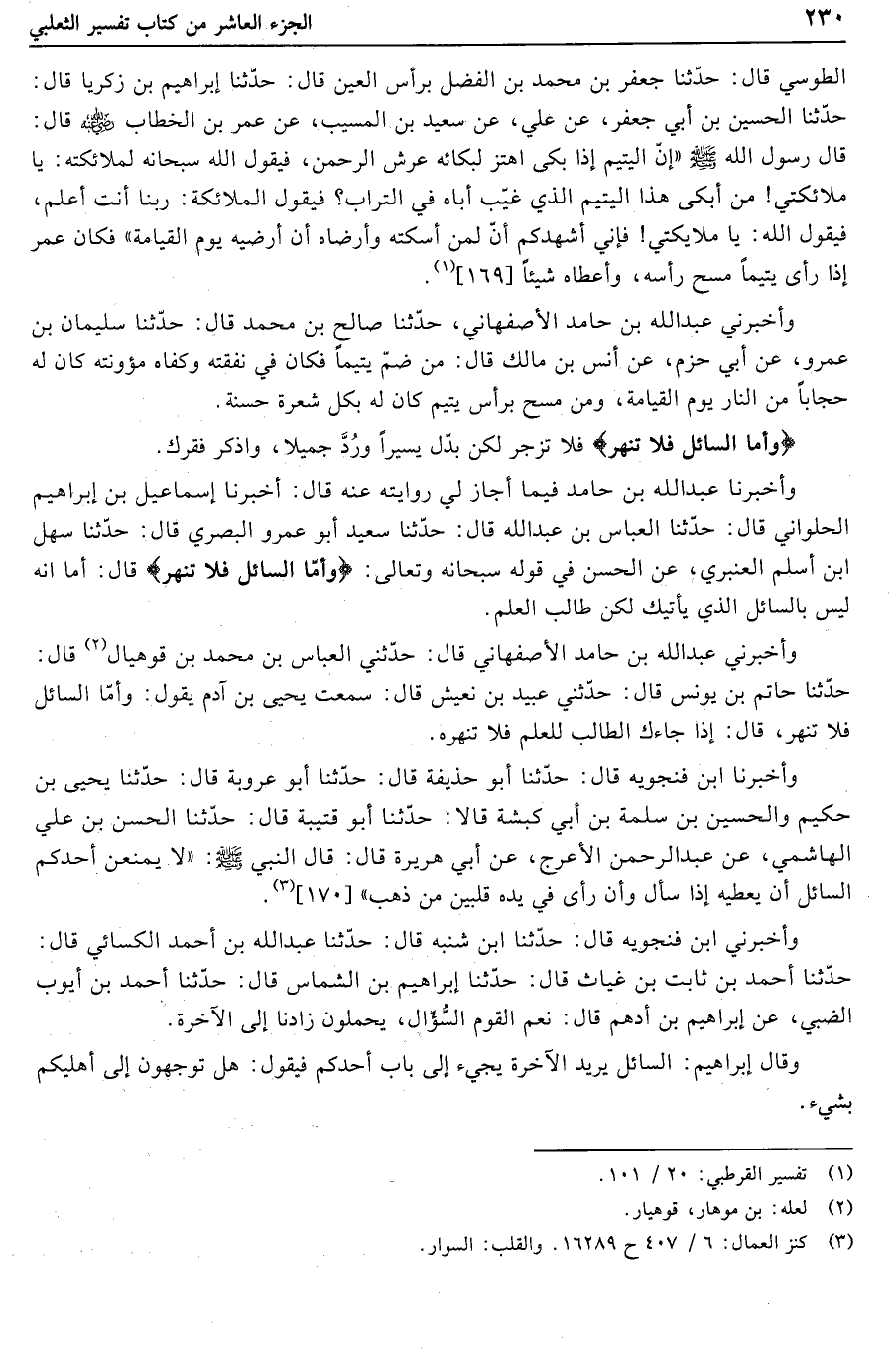 وأخبرنا عبد الله بن حامد فيما أجاز لي روايته عنه قال: أخبرنا إسماعيل بن إبراهيم الحلواني قال: حدّثنا العباس بن عبد الله قال: حدّثنا سعيد أبو عمرو البصري قال: حدّثنا سهل ابن أسلم العنبري، عن الحسن في قوله سبحانه وتعالى: وَأَمَّا السَّائِلَ فَلا تَنْهَرْ قال: أما انه ليس بالسائل الذي يأتيك لكن طالب العلم.
