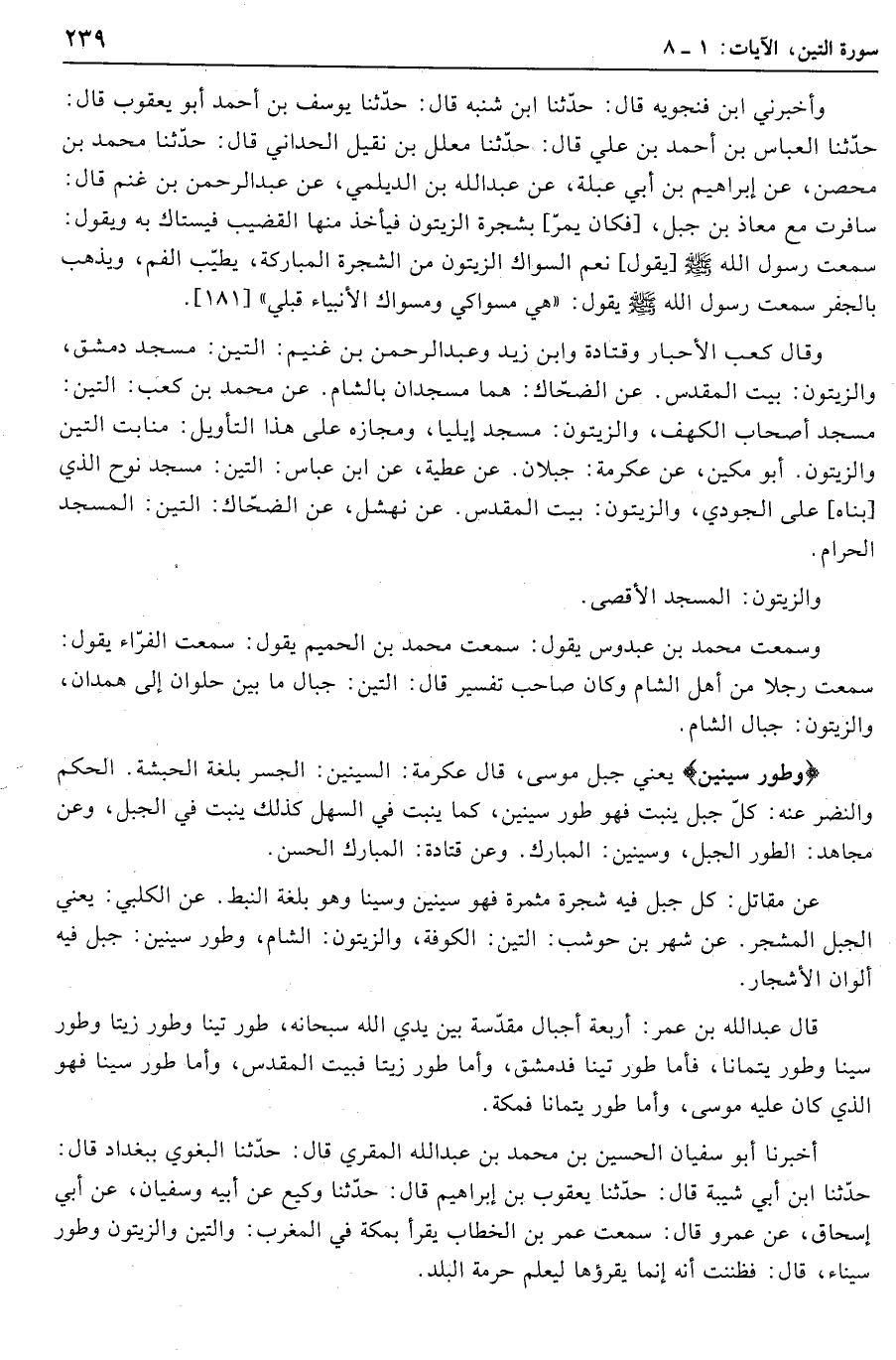 عن مقاتل: كل جبل فيه شجرة مثمرة فهو سينين وسينا وهو بلغة النبط. عن الكلبي: يعني الجبل المشجر. عن شهر بن حوشب: التِّينِ: الكوفة، وَالزَّيْتُونِ: الشام، وَطُورِ سِينِينَ: جبل فيه ألوان الأشجار.