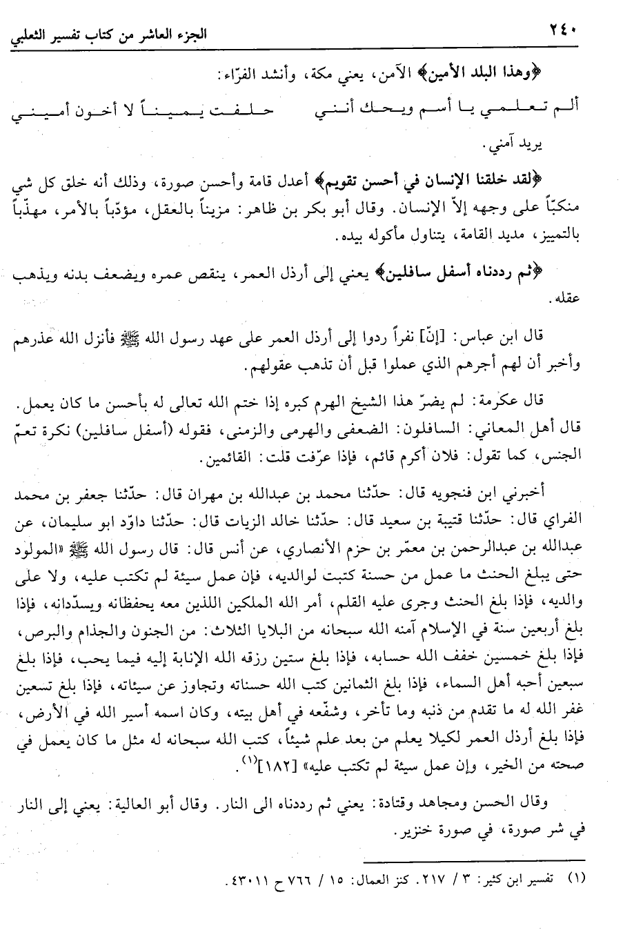 قال أهل المعاني: السافلون: الضعفى والهرمى والزمنى، فقوله (أَسْفَلَ سافِلِينَ) نكرة تعمّ الجنس، كما تقول: فلان أكرم قائم، فإذا عرّفت قلت: القائمين.