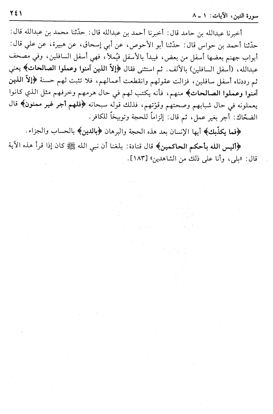 ، وفي مصحف عبد الله، (أسفل السافلين) بالألف. ثم استثنى فقال إِلَّا الَّذِينَ آمَنُوا وَعَمِلُوا الصَّالِحاتِ يعني ثُمَّ رَدَدْناهُ أَسْفَلَ سافِلِينَ، فزالت عقولهم وانقطعت أعمالهم، فلا تثبت لهم حسنة إِلَّا الَّذِينَ آمَنُوا وَعَمِلُوا الصَّالِحاتِ منهم، فأنه يكتب لهم في حال هرمهم وخرفهم مثل الذي كانوا يعملونه في حال شبابهم وصحتهم وقوّتهم، فذلك قوله سبحانه فَلَهُمْ أَجْرٌ غَيْرُ مَمْنُونٍ قال الضحّاك: أجر بغير عمل، ثم قال: إلزاما للحجة وتوبيخا للكافر.