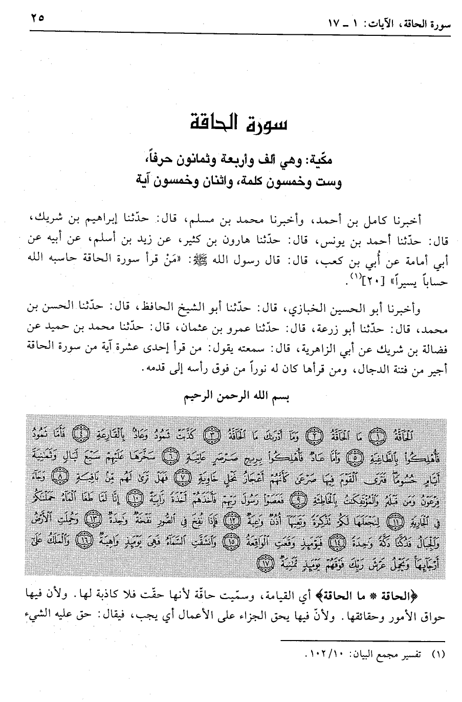وأخبرنا أبو الحسين الخبازي، قال: حدّثنا أبو الشيخ الحافظ، قال: حدّثنا الحسن بن محمد، قال: حدّثنا أبو زرعة، قال: حدّثنا عمرو بن عثمان، قال: حدّثنا محمد بن حميد عن فضالة بن شريك عن أبي الزاهرية، قال: سمعته يقول: من قرأ إحدى عشرة آية من سورة الحاقة أجير من فتنة الدجال، ومن قرأها كان له نورا من فوق رأسه إلى قدمه.