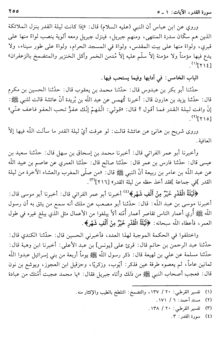 وروي عن ابن عباس أن النبي (عليه السلام) قال: «إذا كانت لَيْلَةُ الْقَدْرِ ينزل الملائكة الذين هم سكّان سدرة المنتهى، ومنهم جبريل، فينزل جبريل ومعه ألوية ينصب لواء منها على قبري، ولواء منها على بيت المقدس، ولواء في المسجد الحرام، ولواء على طور سيناء، ولا يدع فيها مؤمنا ولا مؤمنة إلّا سلّم عليه إلّا مدمن الخمر وآكل الخنزير والمتضمخ بالزعفران» [214] «1» .