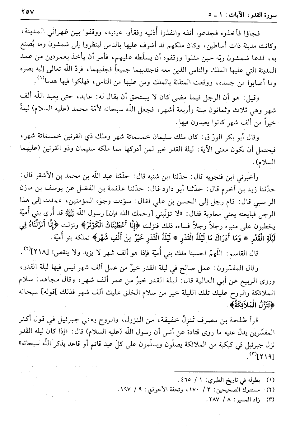 وقال المفسّرون: عمل صالح في ليلة القدر خَيْرٌ مِنْ عمل أَلْفِ شَهْرٍ ليس فيها ليلة القدر، وروى الربيع عن أبي العالية قال: لَيْلَةُ الْقَدْرِ خَيْرٌ مِنْ عمر أَلْفِ شَهْرٍ، وقال مجاهد: سلام الملائكة والروح عليك تلك الليلة خير من سلام الخلق عليك ألف شهر فذلك [قوله] سبحانه تَنَزَّلُ الْمَلائِكَةُ.