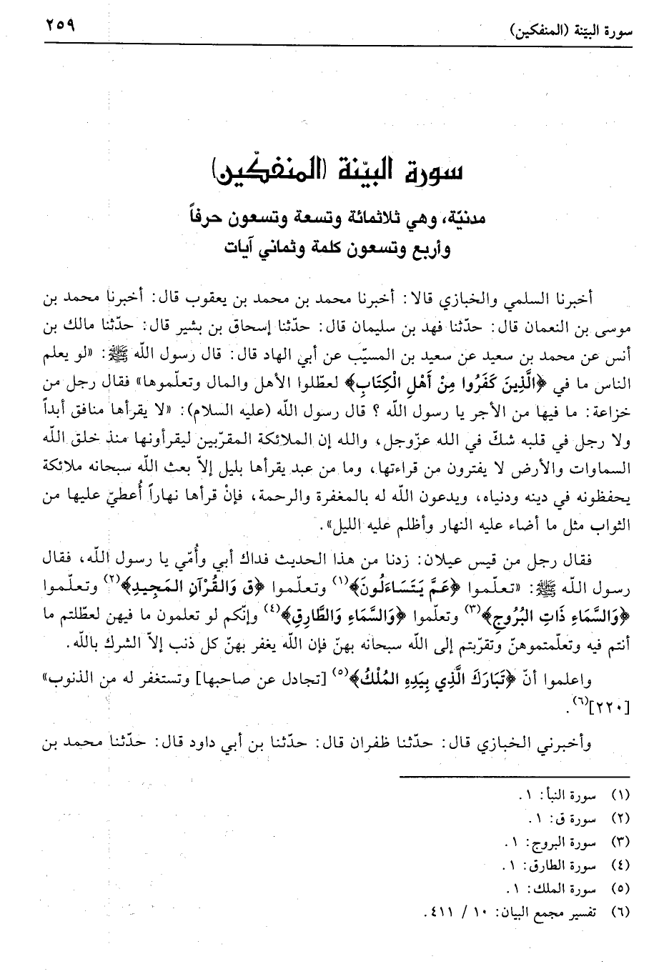 أخبرنا السلمي والخبازي قالا: أخبرنا محمد بن محمد بن يعقوب قال: أخبرنا محمد بن موسى بن النعمان قال: حدّثنا فهد بن سليمان قال: حدّثنا إسحاق بن بشير قال: حدّثنا مالك بن أنس عن محمد بن سعيد عن سعيد بن المسيّب عن أبي الهاد قال: قال رسول الله صلى الله عليه وسلم: «لو يعلم الناس ما في الَّذِينَ كَفَرُوا مِنْ أَهْلِ الْكِتابِ لعطّلوا الأهل والمال وتعلّموها» فقال رجل من خزاعة: ما فيها من الأجر يا رسول الله؟ قال رسول الله (عليه السلام) : «لا يقرأها منافق أبدا ولا رجل في قلبه شكّ في الله عزّ وجلّ، والله إن الملائكة المقرّبين ليقرأونها منذ خلق الله السماوات والأرض لا يفترون من قراءتها، وما من عبد يقرأها بليل إلّا بعث الله سبحانه ملائكة يحفظونه في دينه ودنياه، ويدعون الله له بالمغفرة والرحمة، فإن قرأها نهارا أعطي عليها من الثواب مثل ما أضاء عليه النهار وأظلم عليه الليل» .