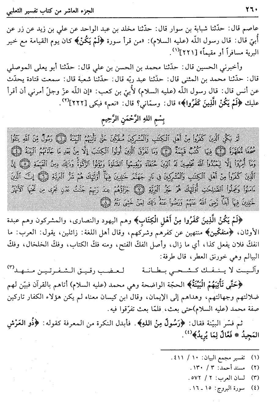 لَمْ يَكُنِ الَّذِينَ كَفَرُوا مِنْ أَهْلِ الْكِتابِ وَالْمُشْرِكِينَ مُنْفَكِّينَ حَتَّى تَأْتِيَهُمُ الْبَيِّنَةُ (1) رَسُولٌ مِنَ اللَّهِ يَتْلُوا صُحُفاً مُطَهَّرَةً (2) فِيها كُتُبٌ قَيِّمَةٌ (3) وَما تَفَرَّقَ الَّذِينَ أُوتُوا الْكِتابَ إِلاَّ مِنْ بَعْدِ ما جاءَتْهُمُ الْبَيِّنَةُ (4)