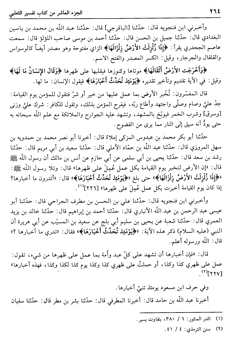 وأخبرني ابن فنجويه قال: حدّثنا علي بن الحسن بن مطرف الجراحي قال: حدّثنا أبو عيسى عبد الرحمن بن عبد الله الأنباري قال: حدّثنا أحمد بن إبراهيم قال: حدّثنا خالد بن يزيد العمري قال: حدّثنا شعبة عن يحيى بن سليم أبي بلج عن سعيد بن المسيّب عن أبي هريرة أن النبي (عليه السلام) ذكر هذه الآية: «يَوْمَئِذٍ تُحَدِّثُ أَخْبارَها» فقال: «تدري ما أخبارها؟» قال: الله ورسوله أعلم.
