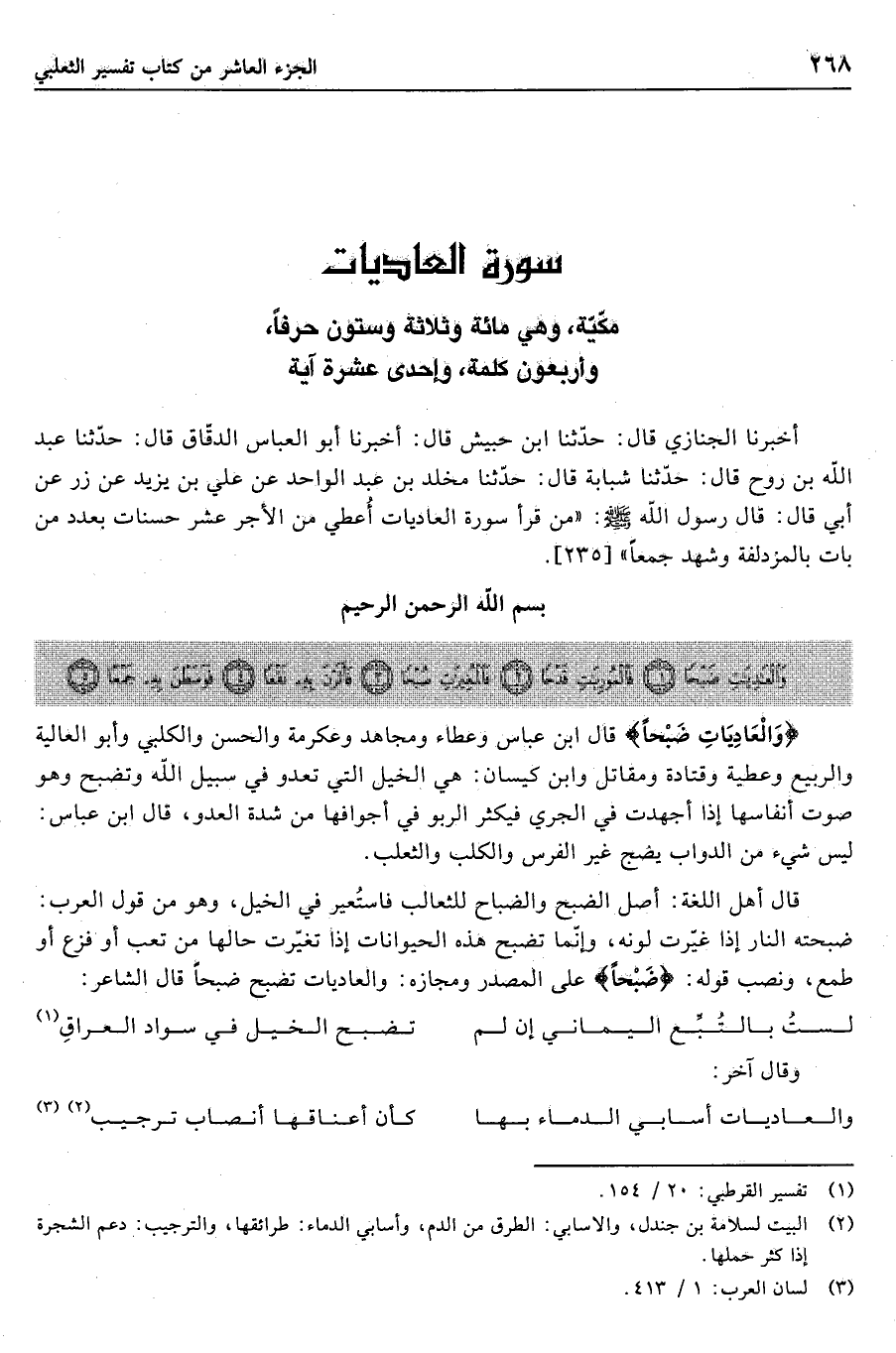 وَالْعادِياتِ ضَبْحاً (1) فَالْمُورِياتِ قَدْحاً (2) فَالْمُغِيراتِ صُبْحاً (3) فَأَثَرْنَ بِهِ نَقْعاً (4)