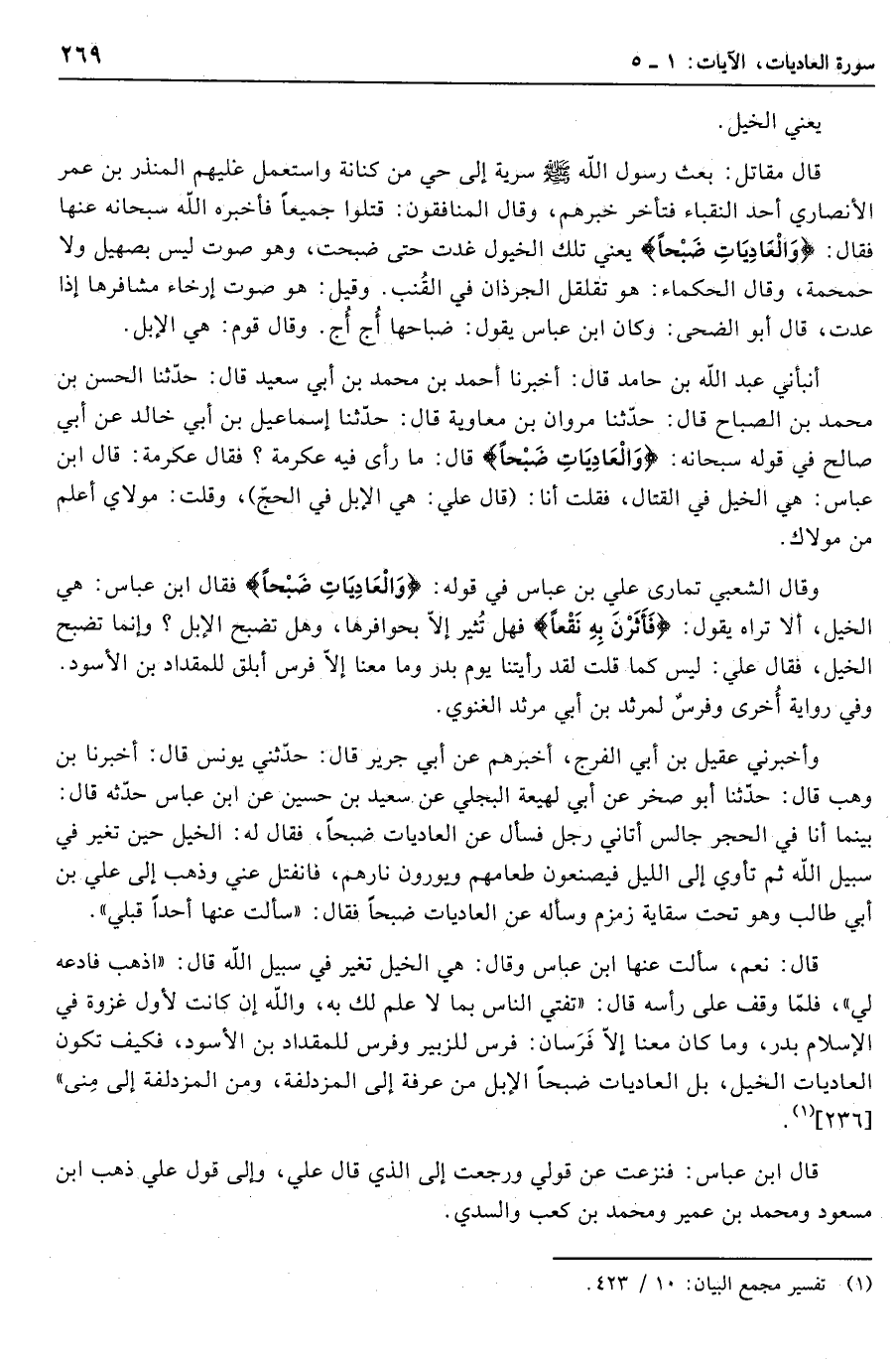 وقال الشعبي تمارى علي ابن عباس في قوله: وَالْعادِياتِ ضَبْحاً فقال ابن عباس: هي الخيل، ألا تراه يقول: فَأَثَرْنَ بِهِ نَقْعاً فهل تثير إلّا بحوافرها، وهل تضبح الإبل؟ وإنما تضبح الخيل، فقال علي: ليس كما قلت لقد رأيتنا يوم بدر وما معنا إلّا فرس أبلق للمقداد بن الأسود.