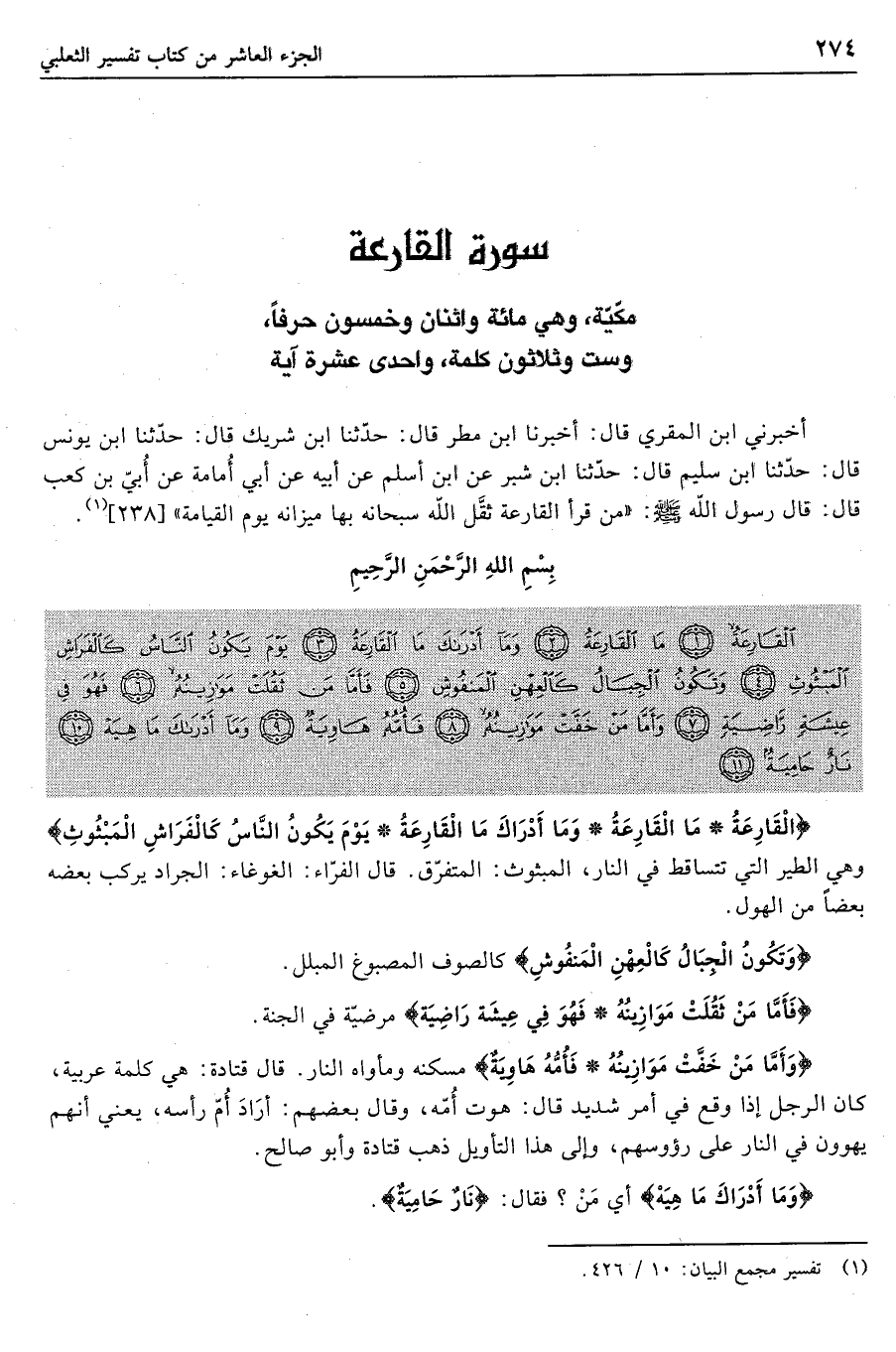 أخبرني ابن المقري قال: أخبرنا ابن مطر قال: حدّثنا ابن شريك قال: حدّثنا ابن يونس قال: حدّثنا ابن سليم قال: حدّثنا ابن شبر عن ابن أسلم عن أبيه عن أبي أمامة عن أبيّ بن كعب قال: قال رسول الله صلّى الله عليه وسلّم: «من قرأ القارعة ثقّل الله سبحانه بها ميزانه يوم القيامة» [238] «1» .