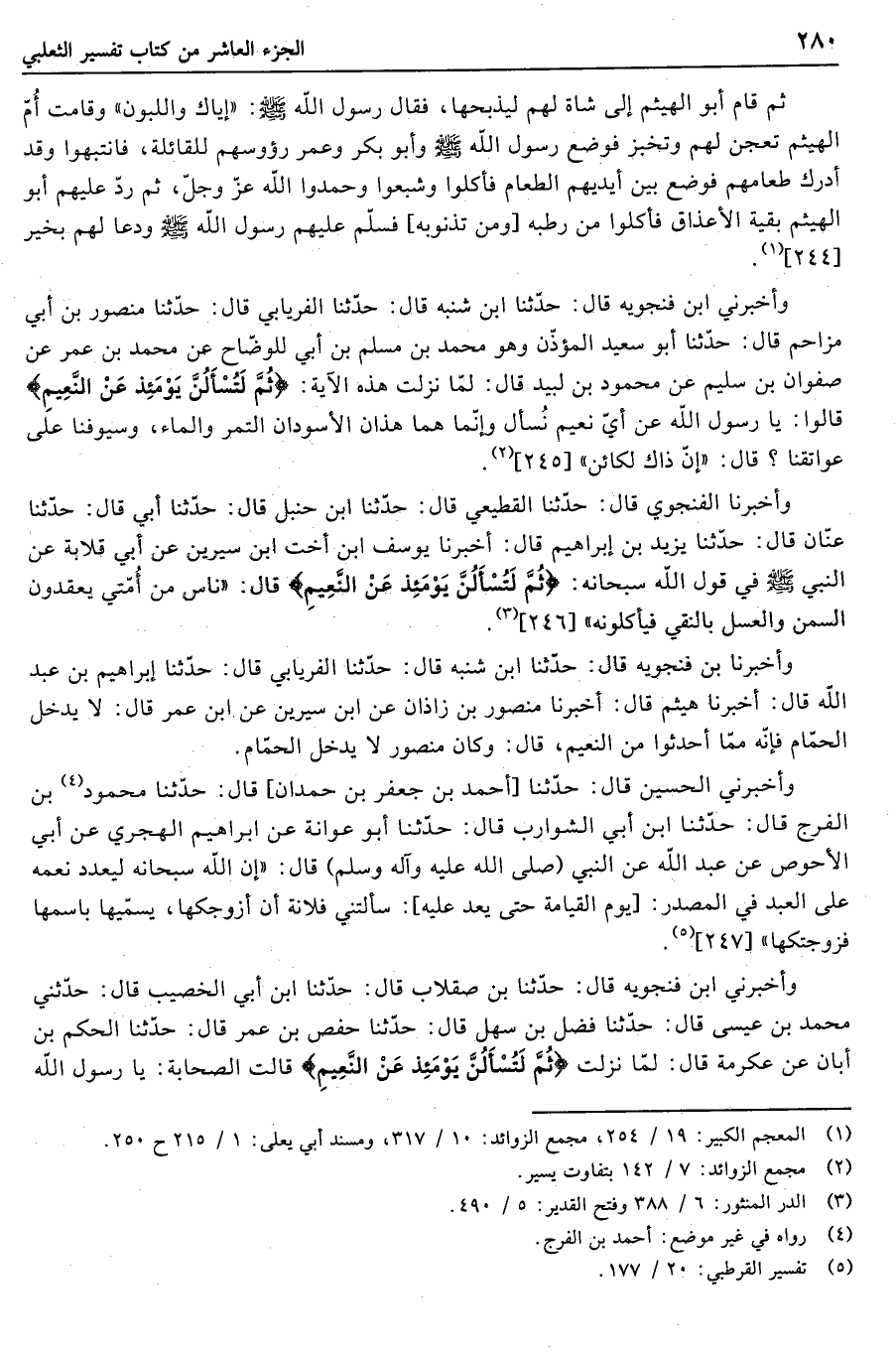 وأخبرنا الفنجوي قال: حدّثنا القطيعي قال: حدّثنا ابن حنبل قال: حدّثنا أبي قال: حدّثنا عنّان قال: حدّثنا يزيد بن إبراهيم قال: أخبرنا يوسف ابن أخت ابن سيرين عن أبي قلابة عن النبي صلّى الله عليه وسلّم في قول الله سبحانه: ثُمَّ لَتُسْئَلُنَّ يَوْمَئِذٍ عَنِ النَّعِيمِ قال: «ناس من أمّتي يعقدون السمن والعسل بالنقي فيأكلونه» [246] «3» .