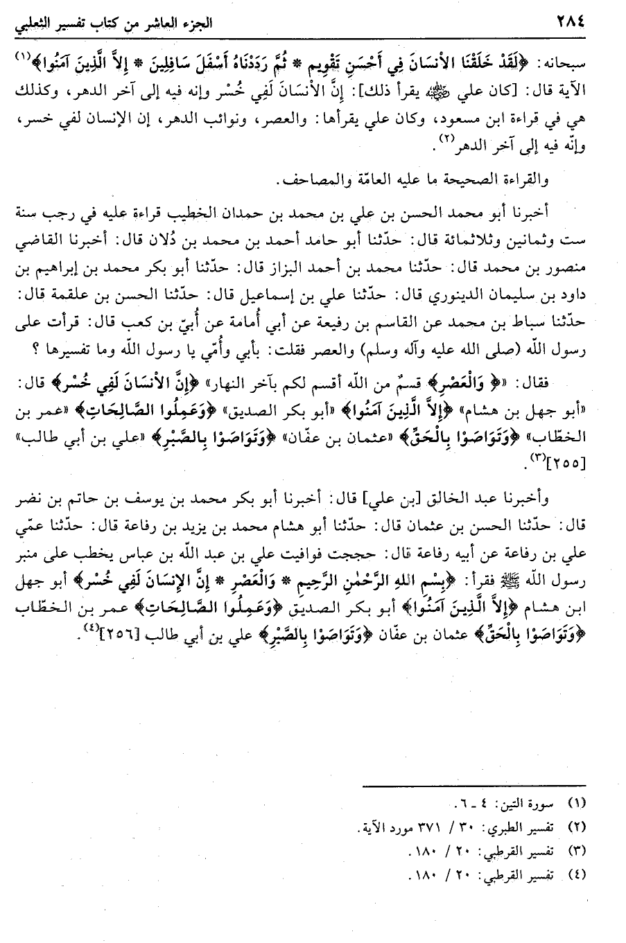 وأخبرنا عبد الخالق [بن علي] قال: أخبرنا أبو بكر محمد بن يوسف بن حاتم بن نضر قال: حدّثنا الحسن بن عثمان قال: حدّثنا أبو هشام محمد بن يزيد بن رفاعة قال: حدّثنا عمّي علي بن رفاعة عن أبيه رفاعة قال: حججت فوافيت علي بن عبد الله بن عباس يخطب على منبر رسول الله صلّى الله عليه وسلّم فقرأ: بِسْمِ اللَّهِ الرَّحْمنِ الرَّحِيمِ وَالْعَصْرِ إِنَّ الْإِنْسانَ لَفِي خُسْرٍ أبو جهل ابن هشام إِلَّا الَّذِينَ آمَنُوا أبو بكر الصديق وَعَمِلُوا الصَّالِحاتِ عمر بن الخطّاب وَتَواصَوْا بِالْحَقِّ عثمان بن عفّان وَتَواصَوْا بِالصَّبْرِ علي بن أبي طالب [256] «4» .