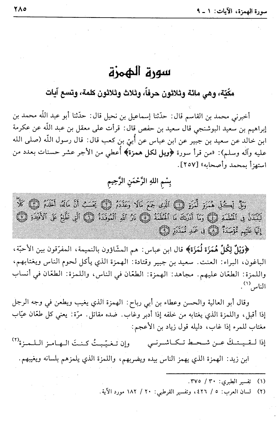 أخبرني محمد بن القاسم قال: حدّثنا إسماعيل بن نحيل قال: حدّثنا أبو عبد الله محمد بن إبراهيم بن سعيد البوشنجي قال سعيد بن حفص قال: قرأت على معقل بن عبد الله عن عكرمة ابن خالد عن سعيد بن جبير عن ابن عباس عن أبيّ بن كعب قال: قال رسول الله (صلى الله عليه وآله وسلّم) : «من قرأ سورة وَيْلٌ لِكُلِّ هُمَزَةٍ أعطي من الأجر عشر حسنات بعدد من استهزأ بمحمد وأصحابه» [257] .