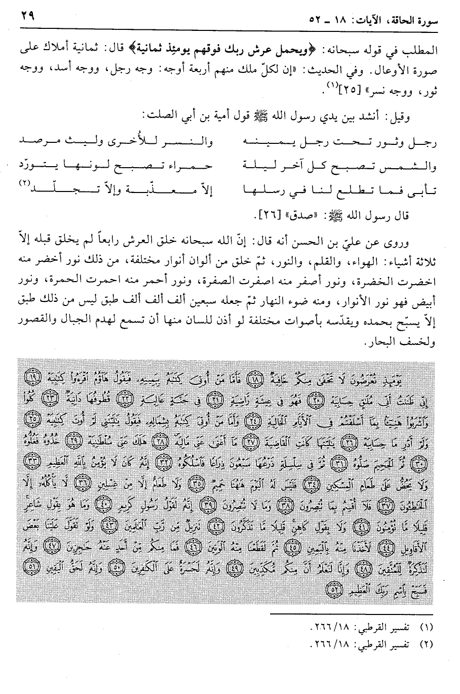 المطلب في قوله سبحانه: وَيَحْمِلُ عَرْشَ رَبِّكَ فَوْقَهُمْ يَوْمَئِذٍ ثَمانِيَةٌ قال: ثمانية أملاك على صورة الأوعال.
