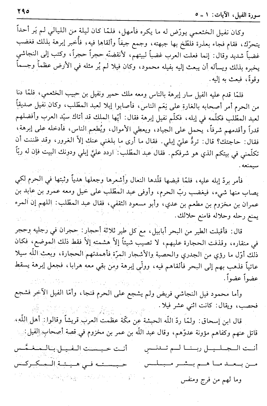 فلمّا قدم عليه الفيل سار أبرهة بالناس ومعه ملك حمير ونفيل بن حبيب الخثعمي، فلمّا دنا من الحرم أمر أصحابه بالغارة على نعم الناس، فأصابوا إبلا لعبد المطّلب، وكان نفيل صديقا لعبد المطّلب فكلّمه في إبله، فكلّم نفيل أبرهة فقال: أيّها الملك قد أتاك سيّد العرب وأفضلهم قدرا وأقدمهم شرفا، يحمل على الجياد، ويعطي الأموال، ويطعم الناس، فأدخله على أبرهة، فقال: حاجتك؟ قال: تردّ عليّ إبلي. فقال ما أرى ما بلغني عنك إلّا الغرور، وقد ظننت أن تكلّمني في بيتكم الذي هو شرفكم. فقال عبد المطّلب: اردد عليّ إبلي ودونك البيت فإن له ربّا سيمنعه.