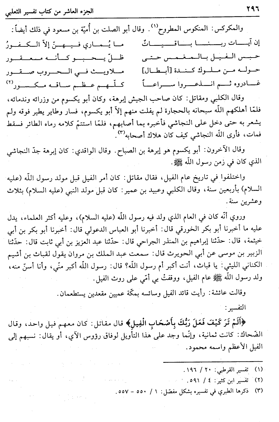 واختلفوا في تاريخ عام الفيل، فقال مقاتل: كان أمر الفيل قبل مولد رسول الله (عليه السلام) بأربعين سنة، وقال الكلبي وعبيد بن عمير: كان قبل مولد النبي (عليه السلام) بثلاث وعشرين سنة.