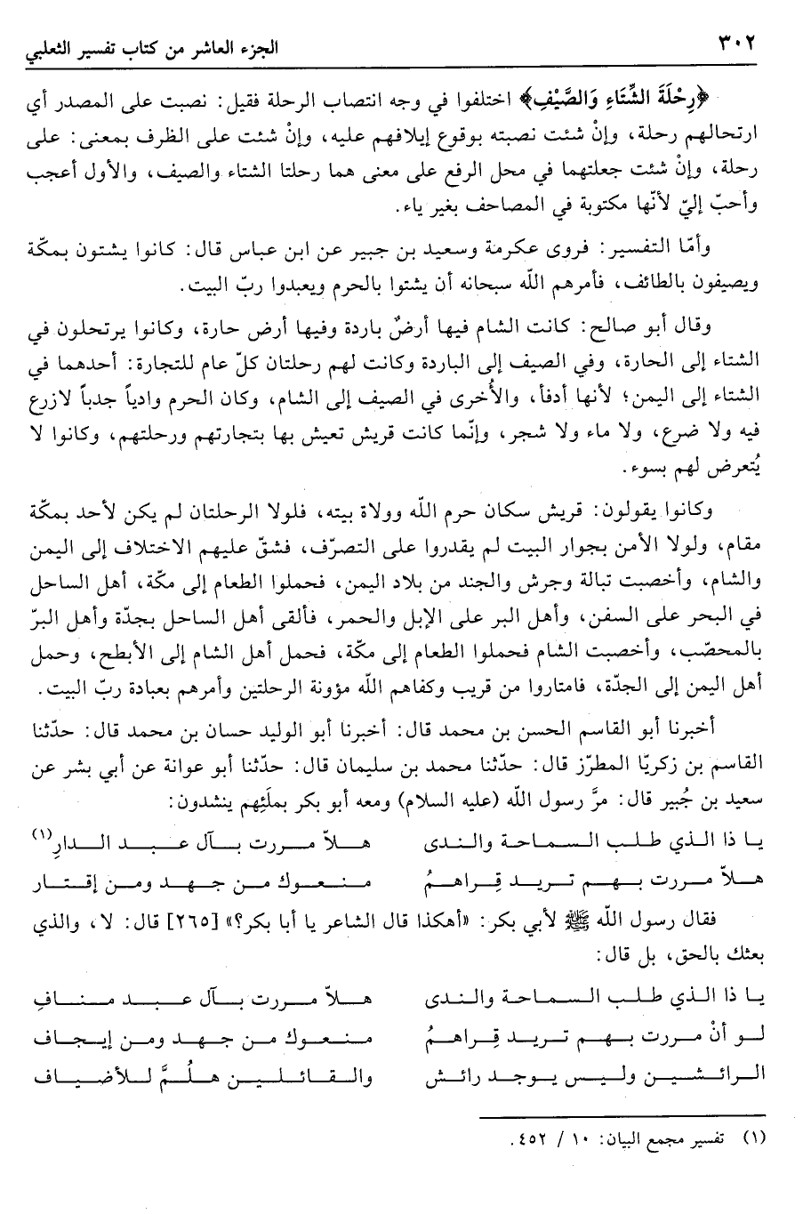 وأمّا التفسير: فروى عكرمة وسعيد بن جبير عن ابن عباس قال: كانوا يشتون بمكّة ويصيفون بالطائف، فأمرهم الله سبحانه أن يشتوا بالحرم ويعبدوا ربّ البيت.