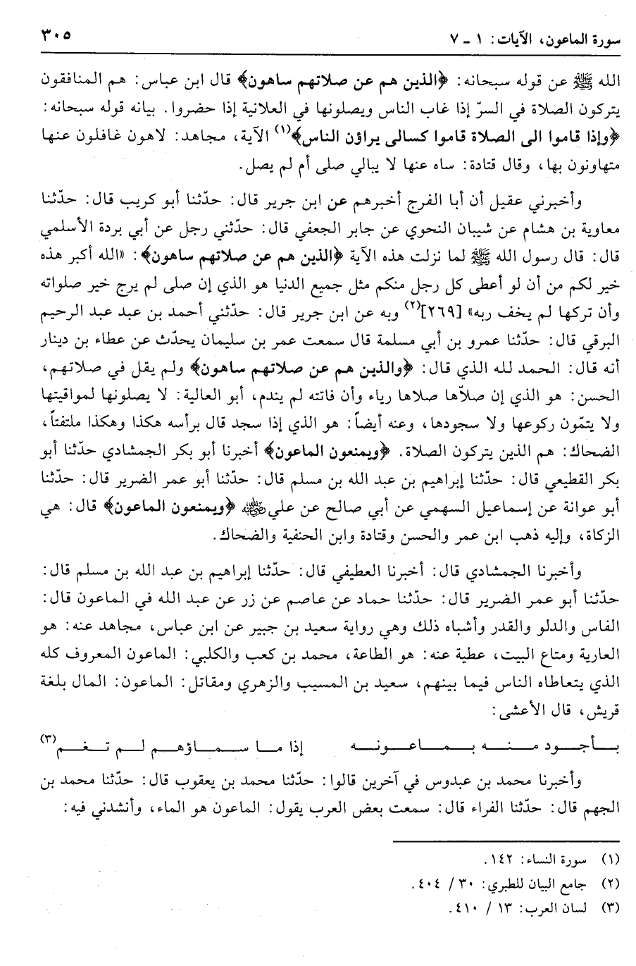 [269] «2» وبه عن ابن جرير قال: حدّثني أحمد بن عبد عبد الرحيم البرقي قال: حدّثنا عمرو بن أبي مسلمة قال سمعت عمر بن سليمان يحدّث عن عطاء بن دينار أنه قال: الحمد لله الذي قال: الَّذِينَ هُمْ عَنْ صَلاتِهِمْ ساهُونَ ولم يقل في صلاتهم، الحسن: هو الذي إن صلّاها صلاها رياء وأن فاتته لم يندم، أبو العالية: لا يصلونها لمواقيتها ولا يتمّون ركوعها ولا سجودها، وعنه أيضا: هو الذي إذا سجد قال برأسه هكذا وهكذا ملتفتا، الضحاك: هم الذين يتركون الصلاة. وَيَمْنَعُونَ الْماعُونَ