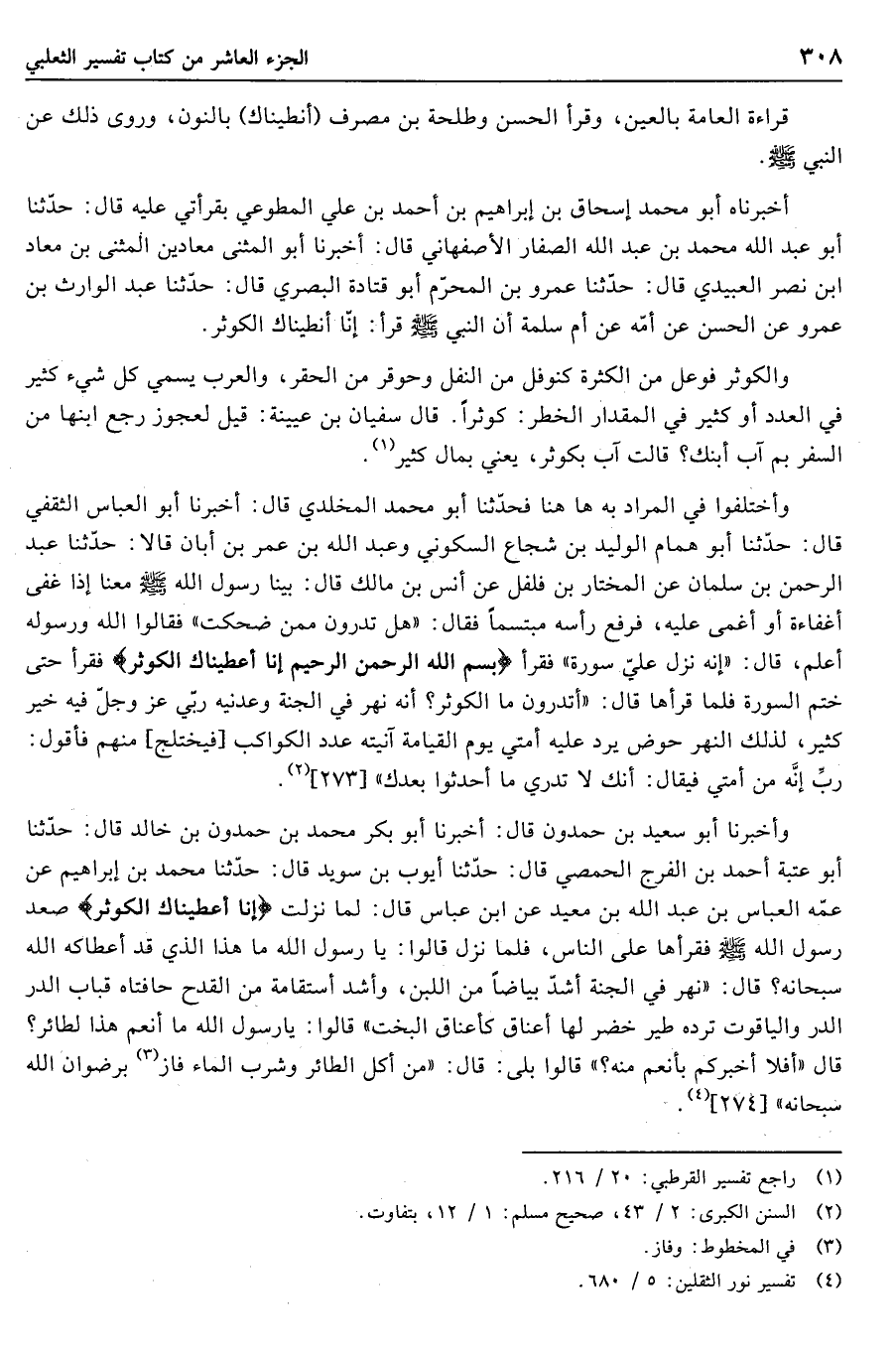 أخبرناه أبو محمد إسحاق بن إبراهيم بن أحمد بن علي المطوعي بقراءتي عليه قال: حدّثنا أبو عبد الله محمد بن عبد الله الصفار الأصفهاني قال: أخبرنا أبو المثنى معادين المثنى بن معاد ابن نصر العبيدي قال: حدّثنا عمرو بن المحرّم أبو قتادة البصري قال: حدّثنا عبد الوارث بن عمرو عن الحسن عن أمّه عن أم سلمة أن النبي صلى الله عليه وسلم قرأ: إنّا أنطيناك الكوثر.