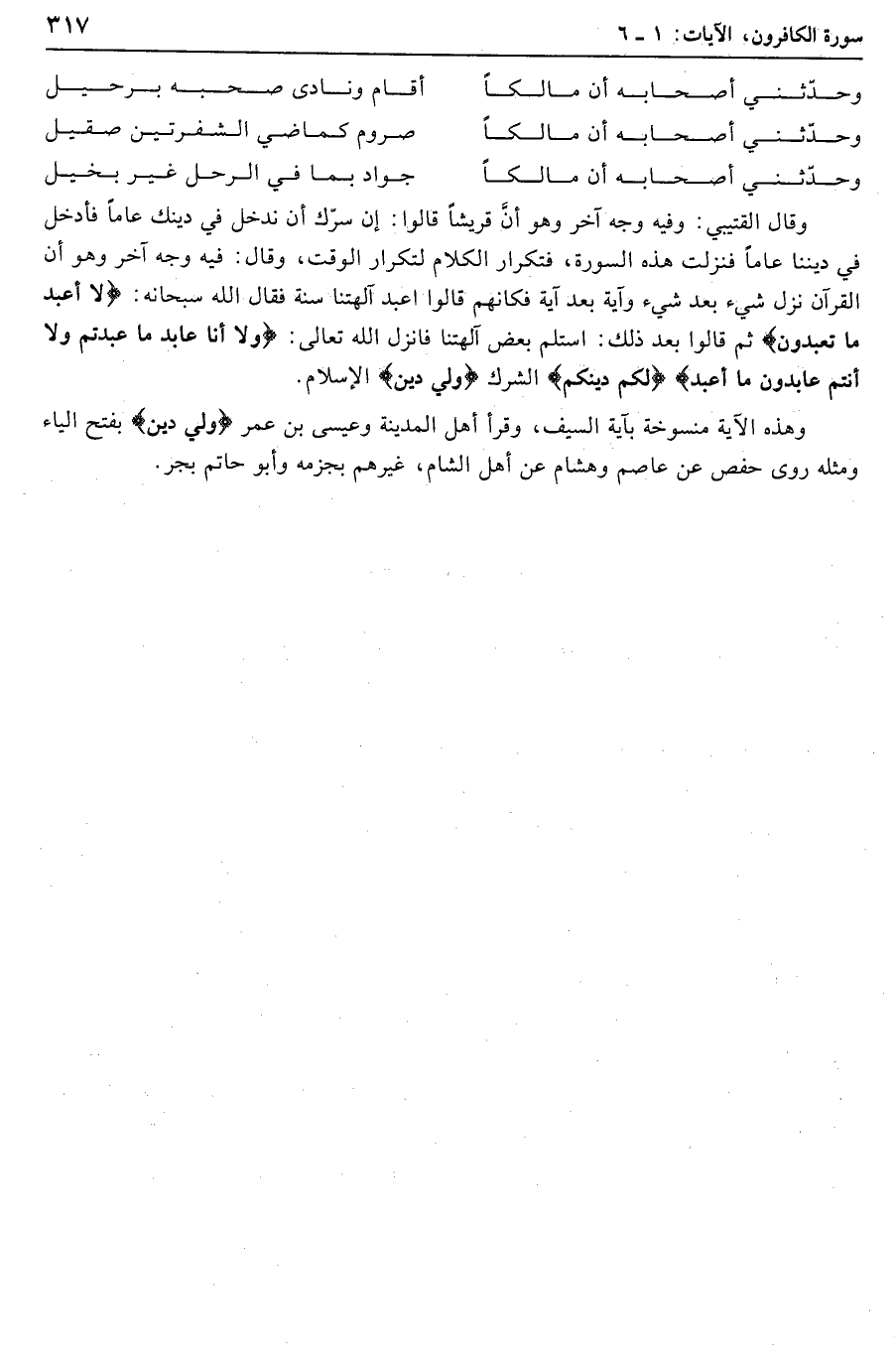 وقال القتيبي: وفيه وجه آخر وهو أنّ قريشا قالوا: إن سرّك أن ندخل في دينك عاما فأدخل في ديننا عاما فنزلت هذه السورة، فتكرار الكلام لتكرار الوقت، وقال: فيه وجه آخر وهو أن القرآن نزل شيء بعد شيء وآية بعد آية فكأنهم قالوا اعبد آلهتنا سنة فقال الله سبحانه: لا أَعْبُدُ ما تَعْبُدُونَ ثم قالوا بعد ذلك: استلم بعض آلهتنا فانزل الله تعالى: وَلا أَنا عابِدٌ ما عَبَدْتُّمْ وَلا أَنْتُمْ عابِدُونَ ما أَعْبُدُ. لَكُمْ دِينُكُمْ الشرك وَلِيَ دِينِ الإسلام.