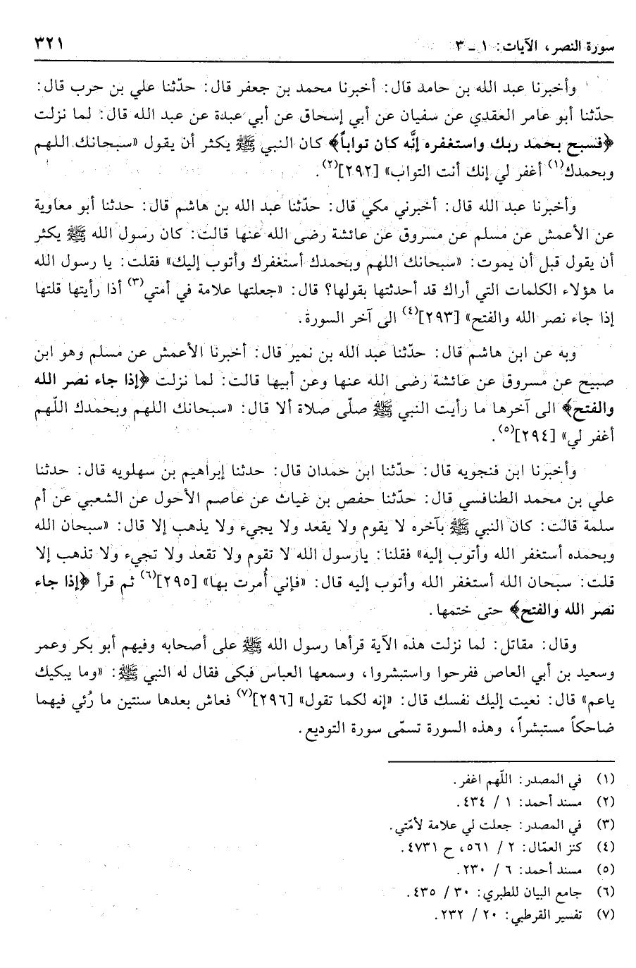 وأخبرنا عبد الله قال: أخبرني مكي قال: حدّثنا عبد الله بن هاشم قال: حدثنا أبو معاوية عن الأعمش عن مسلم عن مسروق عن عائشة رضى الله عنها قالت: كان رسول الله صلى الله عليه وسلم يكثر أن يقول قبل أن يموت: «سبحانك اللهم وبحمدك أستغفرك وأتوب إليك» فقلت: يا رسول الله ما هؤلاء الكلمات التي أراك قد أحدثتها بقولها؟ قال: «جعلتها علامة في أمتي «3» أذا رأيتها قلتها إِذا جاءَ نَصْرُ اللَّهِ وَالْفَتْحُ» [293] «4» الى آخر السورة.