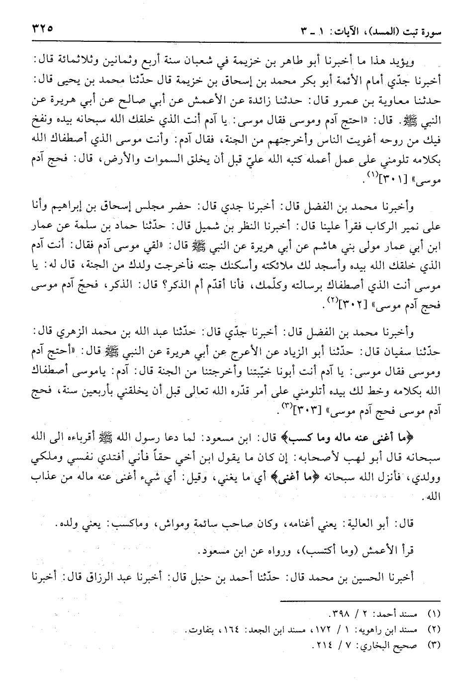 حدّثنا سفيان قال: حدّثنا أبو الزياد عن الأعرج عن أبي هريرة عن النبي صلى الله عليه وسلم قال: «أحتج آدم وموسى فقال موسى: يا آدم أنت أبونا خيّبتنا وأخرجتنا من الجنة قال: آدم: يا موسى اصطفاك الله بكلامه وخط لك بيده أتلومني على أمر قدّره الله تعالى قبل أن يخلقني بأربعين سنة، فحج آدم موسى فحج آدم موسى» [303] «3» .