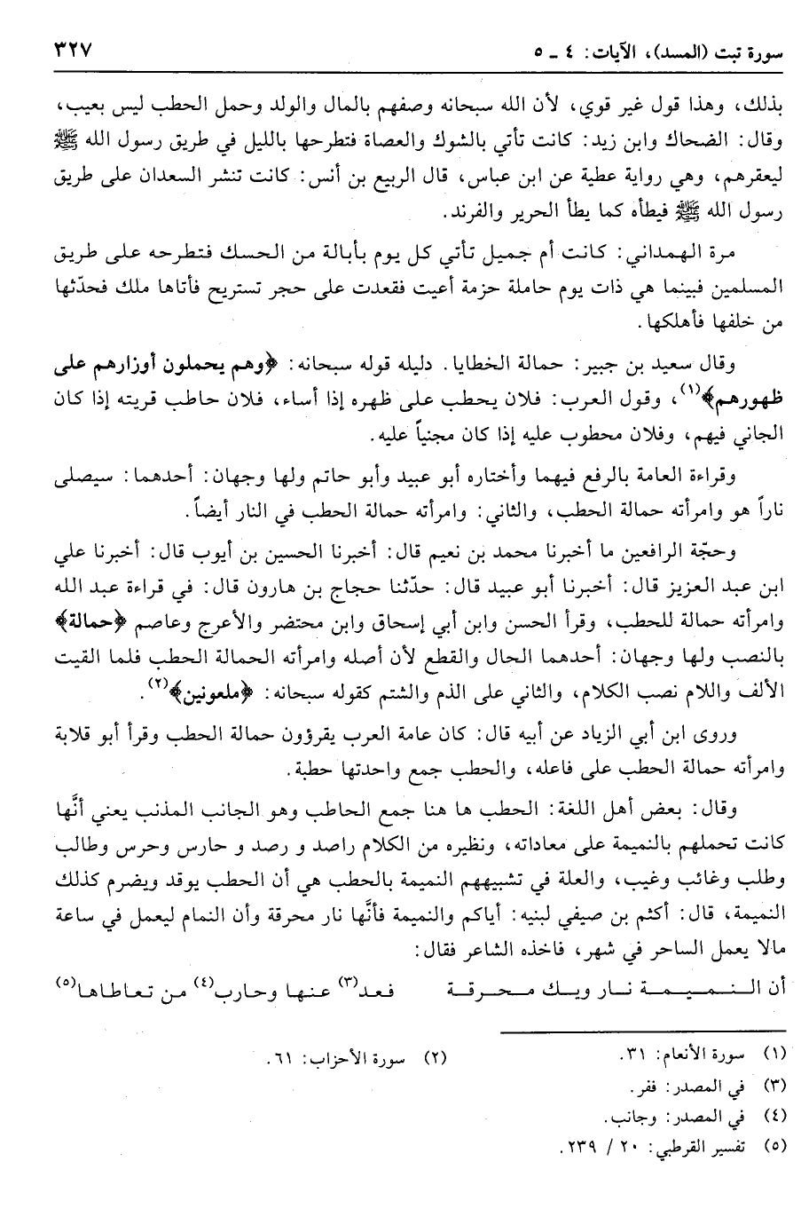 وقال سعيد بن جبير: حمالة الخطايا. دليله قوله سبحانه: وَهُمْ يَحْمِلُونَ أَوْزارَهُمْ عَلى ظُهُورِهِمْ «1» ، وقول العرب: فلان يحطب على ظهره إذا أساء، فلان حاطب قريته إذا كان الجاني فيهم، وفلان محطوب عليه إذا كان مجنيا عليه.
