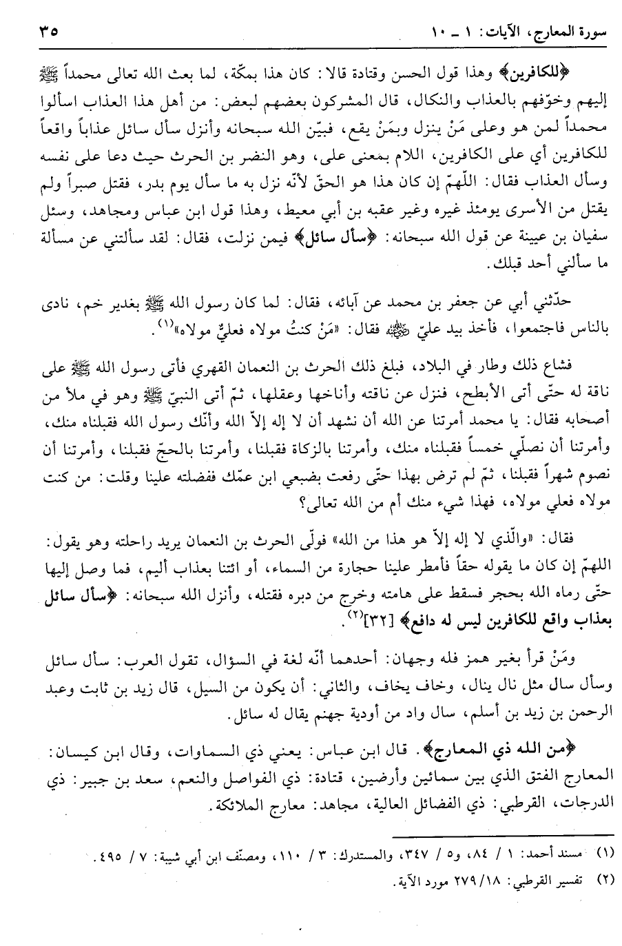 فشاع ذلك وطار في البلاد، فبلغ ذلك الحرث بن النعمان القهري فأتى رسول الله صلّى الله عليه وسلّم على ناقة له حتّى أتى الأبطح، فنزل عن ناقته وأناخها وعقلها، ثمّ أتى النبيّ صلّى الله عليه وسلّم وهو في ملأ من أصحابه فقال: يا محمد أمرتنا عن الله أن نشهد أن لا إله إلّا الله وأنّك رسول الله فقبلناه منك، وأمرتنا أن نصلّي خمسا فقبلناه منك، وأمرتنا بالزكاة فقبلنا، وأمرتنا بالحجّ فقبلنا، وأمرتنا أن نصوم شهرا فقبلنا، ثمّ لم ترض بهذا حتّى رفعت بضبعي ابن عمّك ففضلته علينا وقلت: من كنت مولاه فعلي مولاه، فهذا شيء منك أم من الله تعالى؟