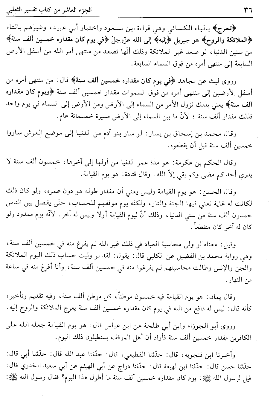وروى ليث عن مجاهد فِي يَوْمٍ كانَ مِقْدارُهُ خَمْسِينَ أَلْفَ سَنَةٍ قال: من منتهى أمره من أسفل الأرضين إلى منتهى أمره من فوق السموات مقدار خمسين ألف سنة ويوم كانَ مِقْدارُهُ أَلْفَ سَنَةٍ يعني بذلك نزول الأمر من السماء إلى الأرض ومن الأرض إلى السماء في يوم واحد فذلك مقدار ألف سنة لأنّ ما بين السماء إلى الأرض مسيرة خمسمائة عام.
