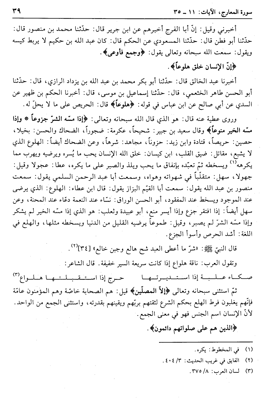 وروى عطية عنه قال: هو الذي قال الله سبحانه وتعالى: إِذا مَسَّهُ الشَّرُّ جَزُوعاً وَإِذا مَسَّهُ الْخَيْرُ مَنُوعاً وقال سعيد بن جبير: شحيحا، عكرمة: ضجورا، الضحاك والحسن: بخيلا، حصين: حريصا، قتادة وابن زيد: حزونا، مجاهد: شرها، وعن الضحاك أيضا: الهلوع الذي لا يشبع، مقاتل: ضيق القلب، ابن كيسان: خلق الله الإنسان يحب ما يسره ويرضيه ويهرب مما يكرهه «1» ويسخطه ثمّ تعبّده بإنفاق ما يحب ويلذ والصبر على ما يكره، عطا: عجولا وقيل: