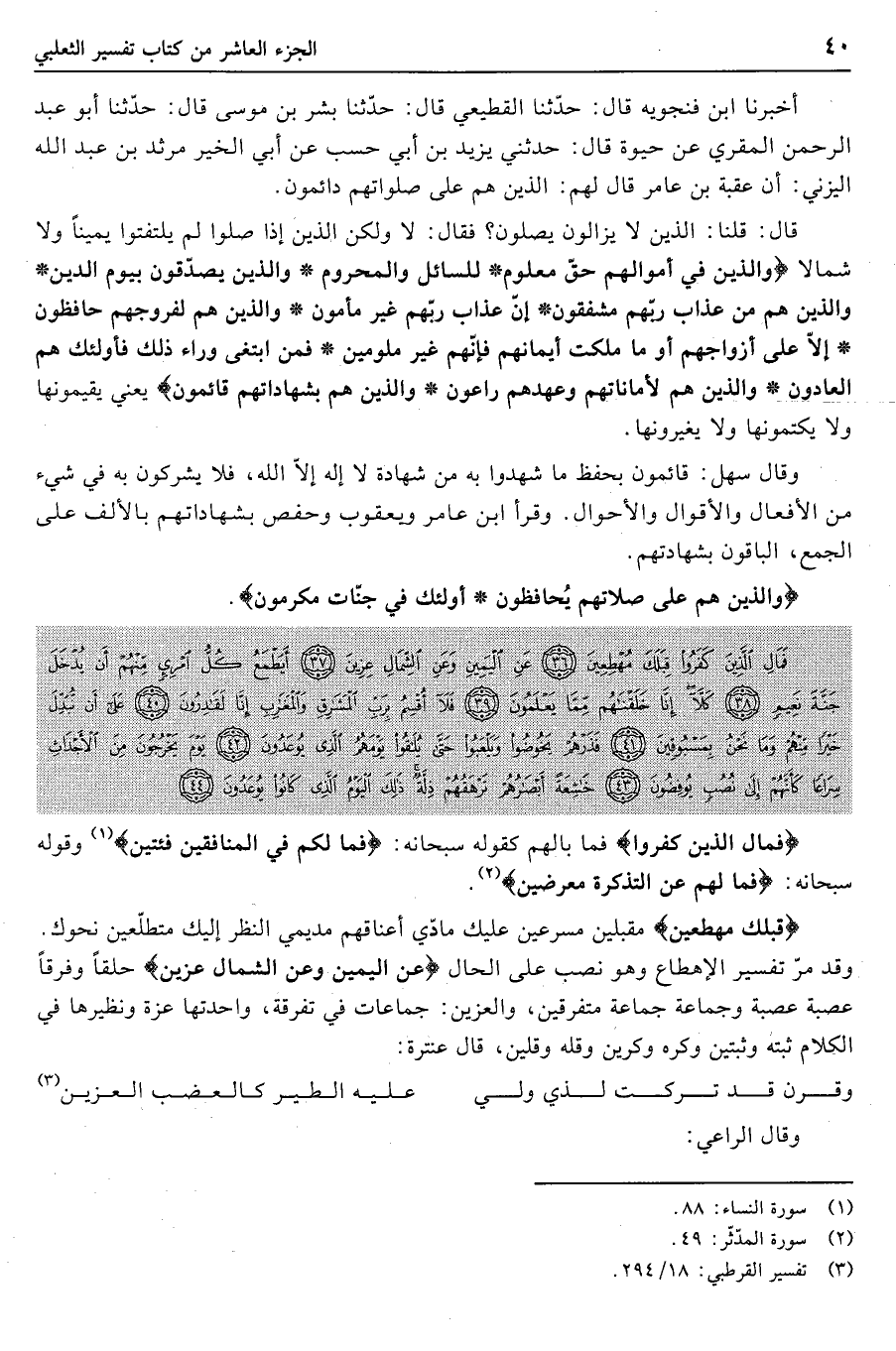 قال: قلنا: الذين لا يزالون يصلون؟ فقال: لا ولكن الذين إذا صلوا لم يلتفتوا يمينا ولا شمالا وَالَّذِينَ فِي أَمْوالِهِمْ حَقٌّ مَعْلُومٌ لِلسَّائِلِ وَالْمَحْرُومِ وَالَّذِينَ يُصَدِّقُونَ بِيَوْمِ الدِّينِ وَالَّذِينَ هُمْ مِنْ عَذابِ رَبِّهِمْ مُشْفِقُونَ إِنَّ عَذابَ رَبِّهِمْ غَيْرُ مَأْمُونٍ وَالَّذِينَ هُمْ لِفُرُوجِهِمْ حافِظُونَ إِلَّا عَلى أَزْواجِهِمْ أَوْ ما مَلَكَتْ أَيْمانُهُمْ فَإِنَّهُمْ غَيْرُ مَلُومِينَ فَمَنِ ابْتَغى وَراءَ ذلِكَ فَأُولئِكَ هُمُ العادُونَ وَالَّذِينَ هُمْ لِأَماناتِهِمْ وَعَهْدِهِمْ راعُونَ وَالَّذِينَ هُمْ بِشَهاداتِهِمْ قائِمُونَ يعني يقيمونها ولا يكتمونها ولا يغيرونها.