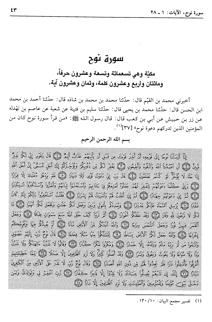 إِنَّا أَرْسَلْنا نُوحاً إِلى قَوْمِهِ أَنْ أَنْذِرْ قَوْمَكَ مِنْ قَبْلِ أَنْ يَأْتِيَهُمْ عَذابٌ أَلِيمٌ (1) قالَ يا قَوْمِ إِنِّي لَكُمْ نَذِيرٌ مُبِينٌ (2) أَنِ اعْبُدُوا اللَّهَ وَاتَّقُوهُ وَأَطِيعُونِ (3) يَغْفِرْ لَكُمْ مِنْ ذُنُوبِكُمْ وَيُؤَخِّرْكُمْ إِلى أَجَلٍ مُسَمًّى إِنَّ أَجَلَ اللَّهِ إِذا جاءَ لا يُؤَخَّرُ لَوْ كُنْتُمْ تَعْلَمُونَ (4)
