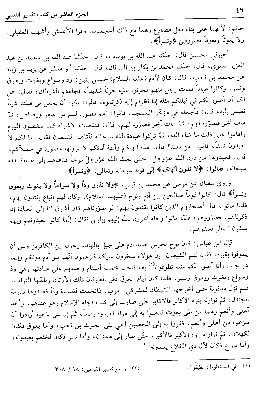 أخبرني الحسين قال: حدّثنا عبد الله بن يوسف، قال: حدّثنا عبد الله بن محمد بن عبد العزيز البغوي، قال: حدّثنا محمد بن بكار بن المرقان، قال: حدّثنا أبو معشر عن يزيد بن زياد عن محمد بن كعب، قال: كان لآدم (عليه السلام) خمس بنين: ود وسواع ويغوث ويعوق ونسر، وكانوا عبادا فمات رجل منهم فحزنوا عليه حزنا شديدا، فجاءهم الشيطان، فقال: هل لكم أن أصور لكم في قبلتكم مثله إذا نظرتم إليه ذكرتموه، قالوا: نكره أن يجعل في قبلتنا شيئا نصلي إليه، قال: فأجعله في مؤخّر المسجد. قالوا: نعم فصوره لهم من صفر ورصاص، ثمّ مات آخر فصوّره لهم، ثمّ مات آخر فصوّره لهم، قال: فنقصت الأشياء كما ينقصون اليوم وأقاموا على ذلك ما شاء الله، ثمّ تركوا عبادة الله سبحانه فأتاهم الشيطان فقال: ما لكم لا تعبدون شيئا، قالوا: من نعبد؟ قال: هذه آلهتكم وآلهة آبائكم لا ترونها مصوّرة في مصلّاكم، قال: فعبدوها من دون الله عزّ وجل، حتّى بعث الله عزّ وجلّ نوحا فدعاهم إلى عبادة الله سبحانه، فقالوا: لا تَذَرُنَّ آلِهَتَكُمْ إلى قوله سبحانه وتعالى: وَنَسْراً.