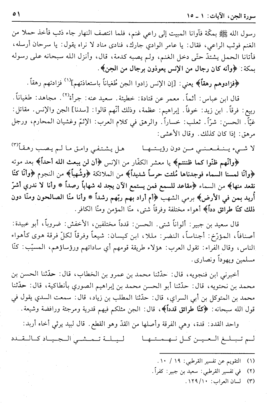 رسول الله صلّى الله عليه وسلّم بمكّة فآوانا المبيت إلى راعي غنم، فلما انتصف النهار جاء ذئب فأخذ حملا من الغنم فوثب الراعي، فقال: يا عامر الوادي جارك، فنادى مناد لا نراه يقول: يا سرحان أرسله، فأتانا الحمل يشتدّ حتّى دخل الغنم، ولم يصبه كدمة، قال، وأنزل الله سبحانه على رسوله بمكة: وَأَنَّهُ كانَ رِجالٌ مِنَ الْإِنْسِ يَعُوذُونَ بِرِجالٍ مِنَ الْجِنِّ فَزادُوهُمْ رَهَقاً