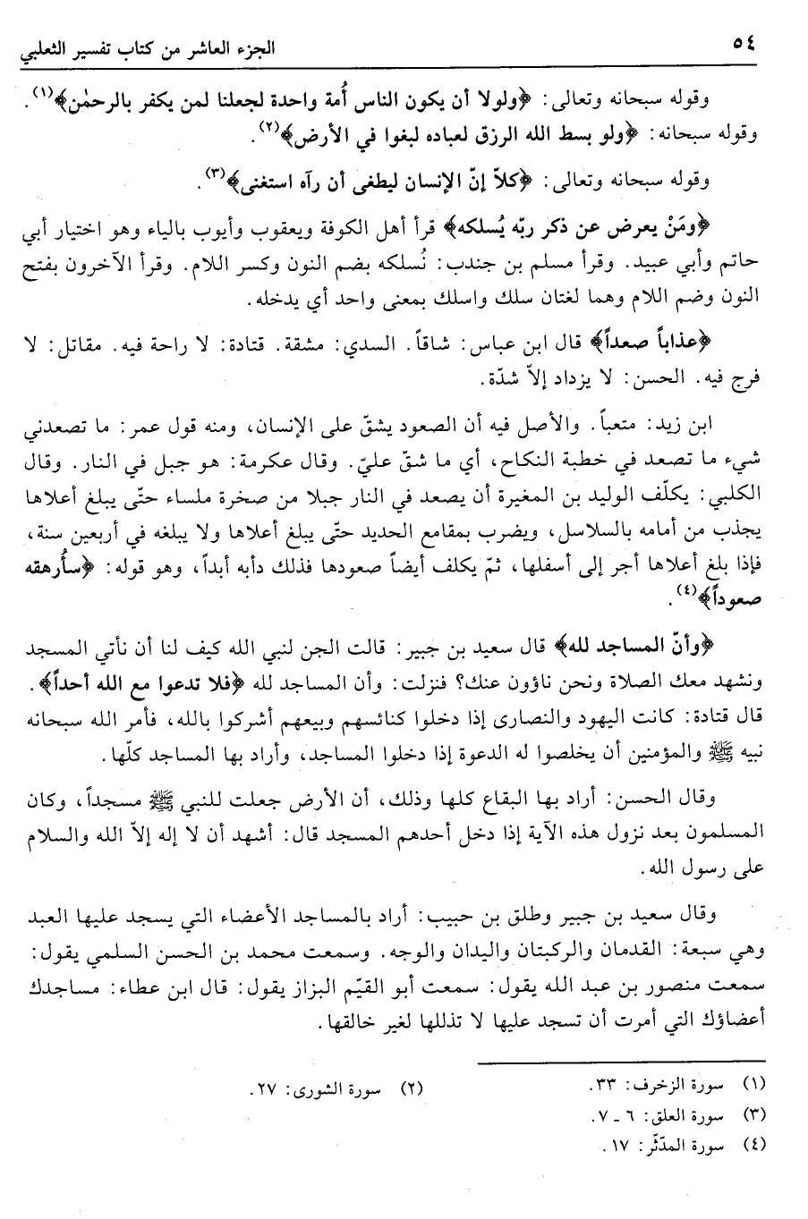 ابن زيد: متعبا. والأصل فيه أن الصعود يشقّ على الإنسان، ومنه قول عمر: ما تصعدني شيء ما تصعد في خطبة النكاح، أي ما شقّ عليّ. وقال عكرمة: هو جبل في النار. وقال الكلبي: يكلّف الوليد بن المغيرة أن يصعد في النار جبلا من صخرة ملساء حتّى يبلغ أعلاها يجذب من أمامه بالسلاسل، ويضرب بمقامع الحديد حتّى يبلغ أعلاها ولا يبلغه في أربعين سنة، فإذا بلغ أعلاها أجر إلى أسفلها، ثمّ يكلف أيضا صعودها فذلك دأبه أبدا، وهو قوله: سَأُرْهِقُهُ صَعُوداً «4» .