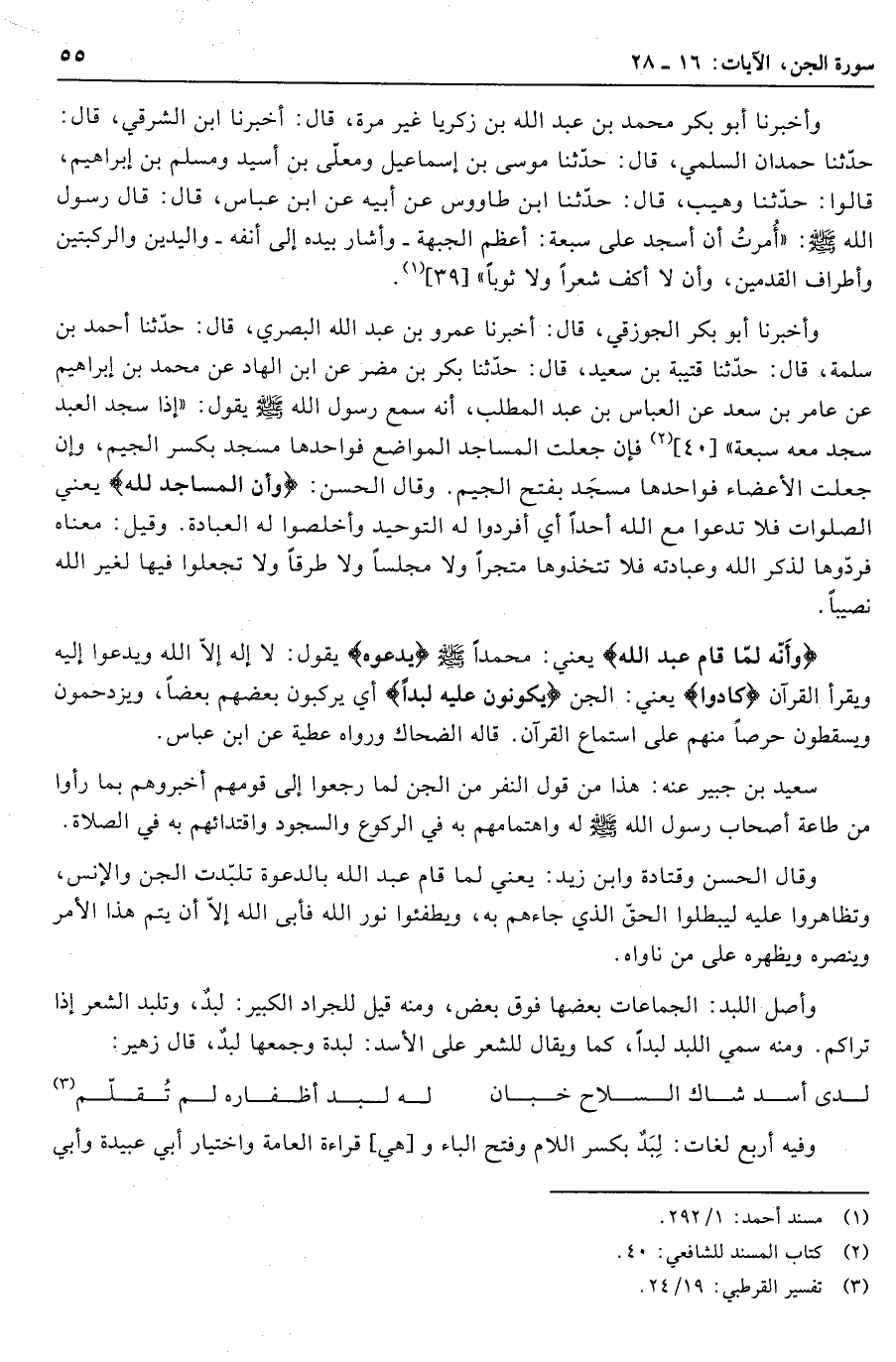 [40] «2» فإن جعلت المساجد المواضع فواحدها مسجد بكسر الجيم، وإن جعلت الأعضاء فواحدها مسجد بفتح الجيم. وقال الحسن: وَأَنَّ الْمَساجِدَ لِلَّهِ يعني الصلوات فَلا تَدْعُوا مَعَ اللَّهِ أَحَداً أي أفردوا له التوحيد وأخلصوا له العبادة. وقيل: معناه فردّوها لذكر الله وعبادته فلا تتخذوها متجرا ولا مجلسا ولا طرقا ولا تجعلوا فيها لغير الله نصيبا.